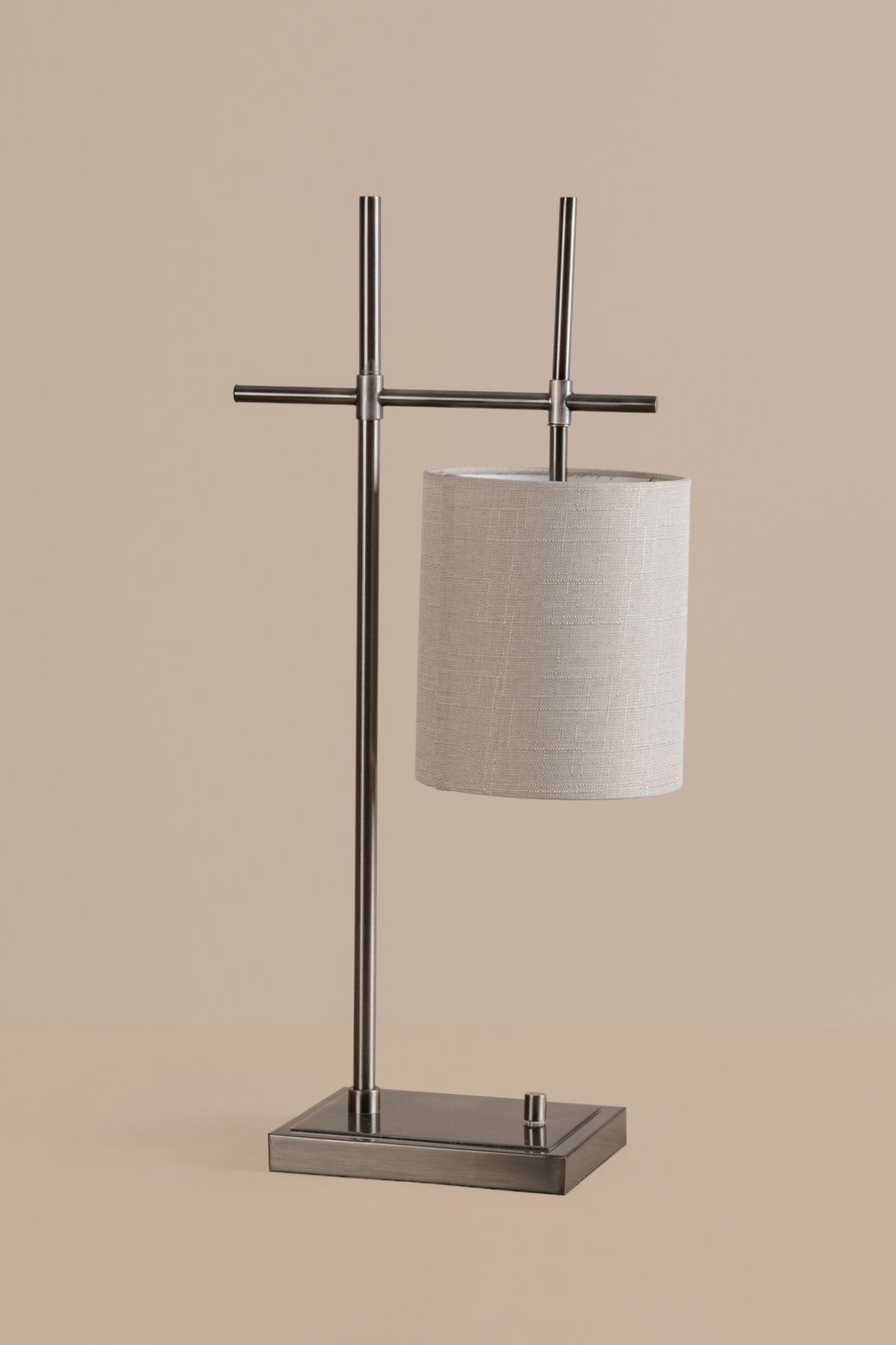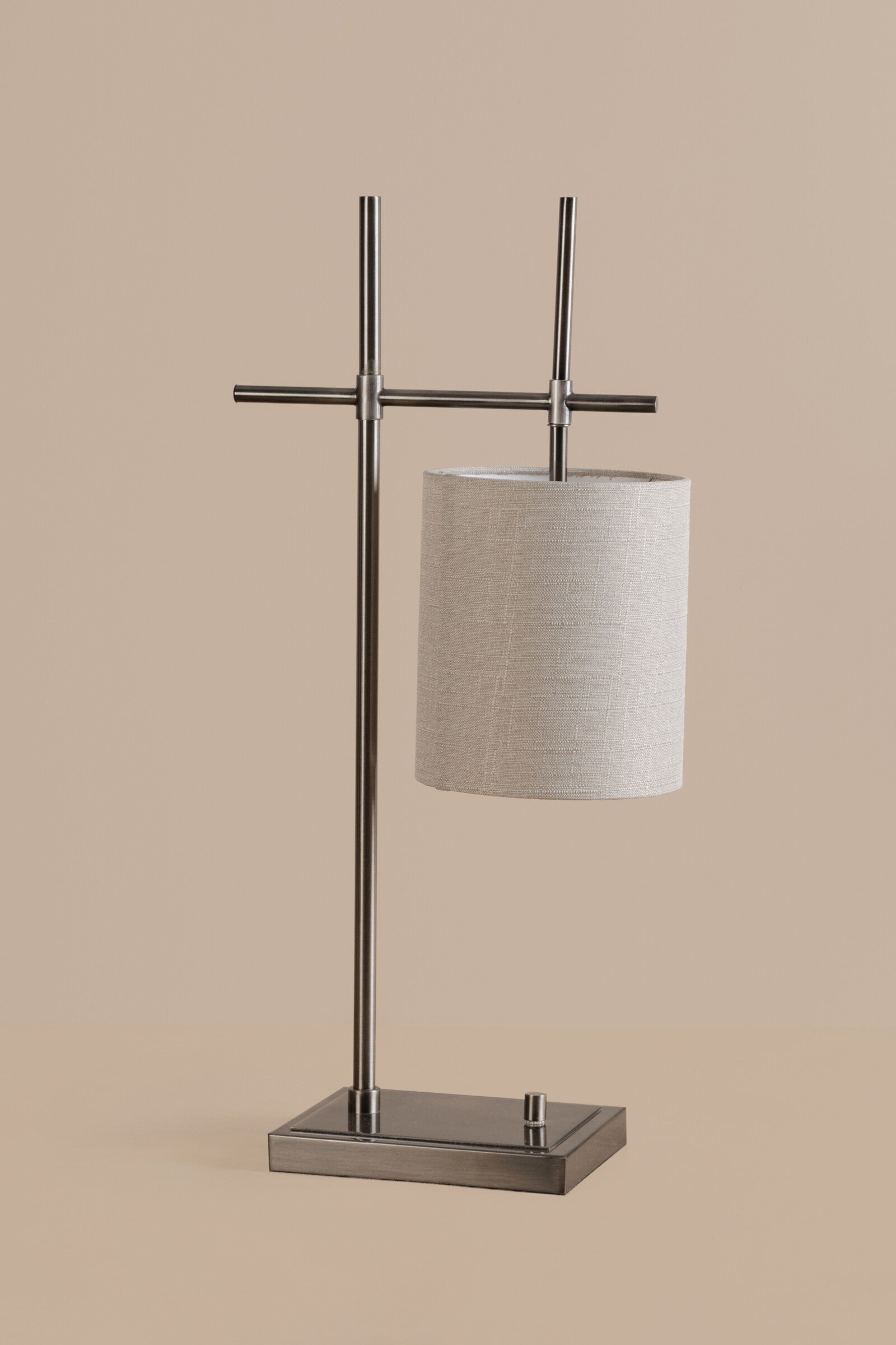 The Sebastion Trend Style Table Lamp, a refined blend of industrial charm and modern elegance. Standing 25.5 inches tall, this lamp features a striking black nickel metal finish and a softly textured grey linen cylinder shade.