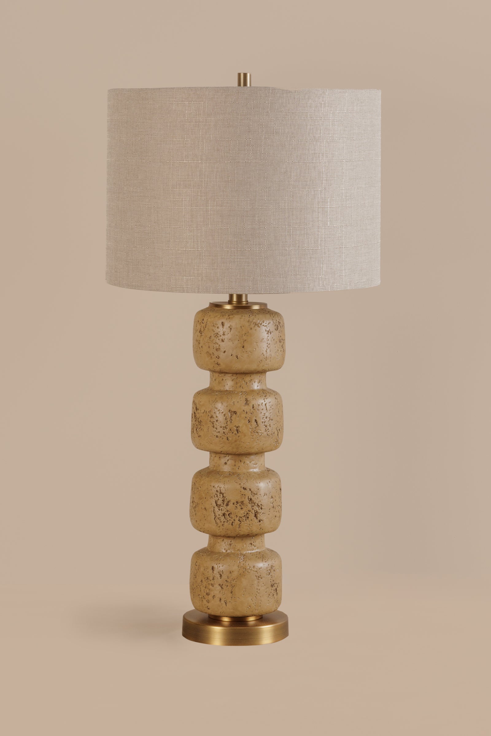 Tan base with antique brass and a tan linen shade