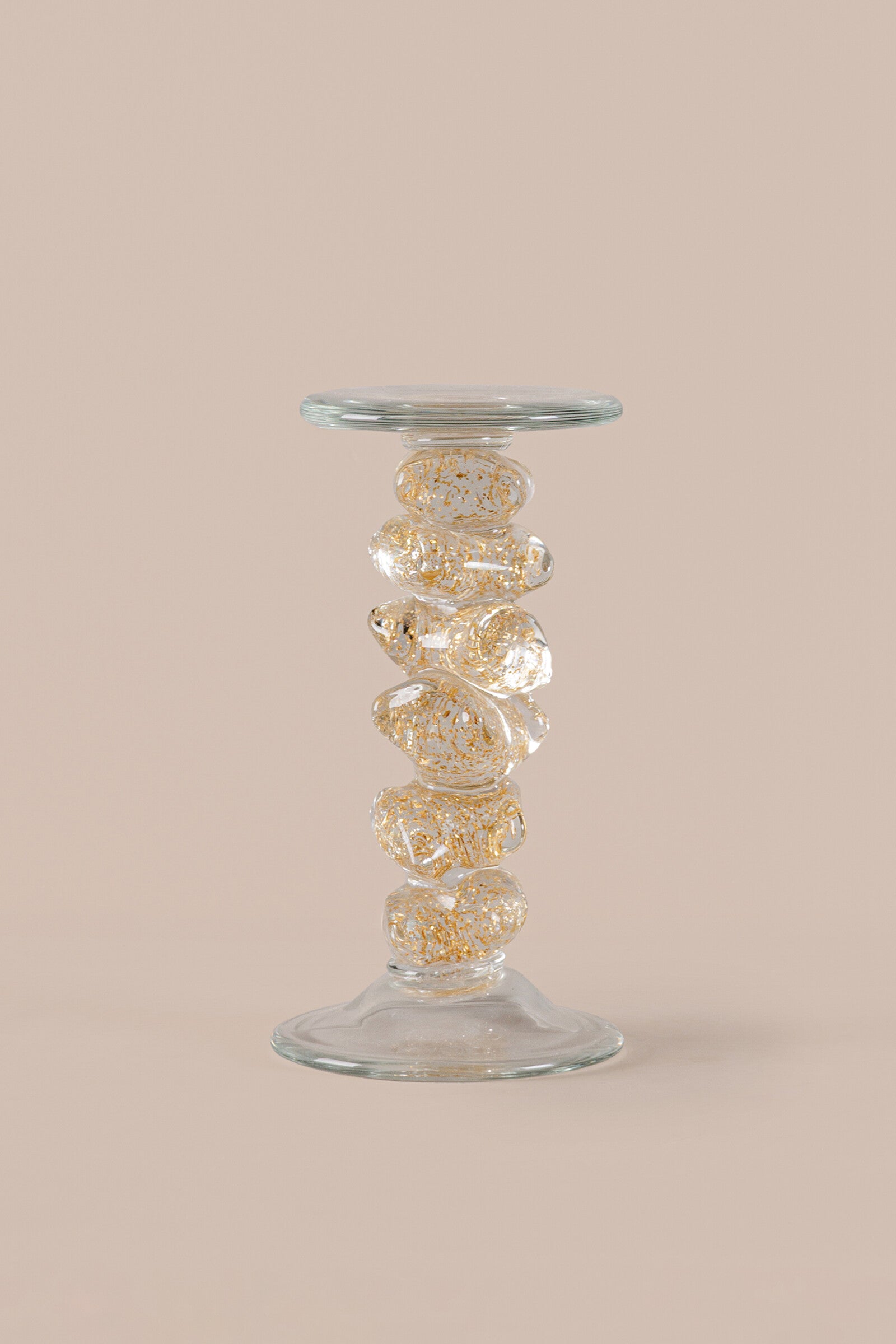 A fusion of art and utility, this handcrafted glass piece showcases a sculpted central spine with molten gold textures, creating a dynamic visual rhythm. With its transparent body and layered organic form, it brings lightness, luxury, and bold character to modern table settings