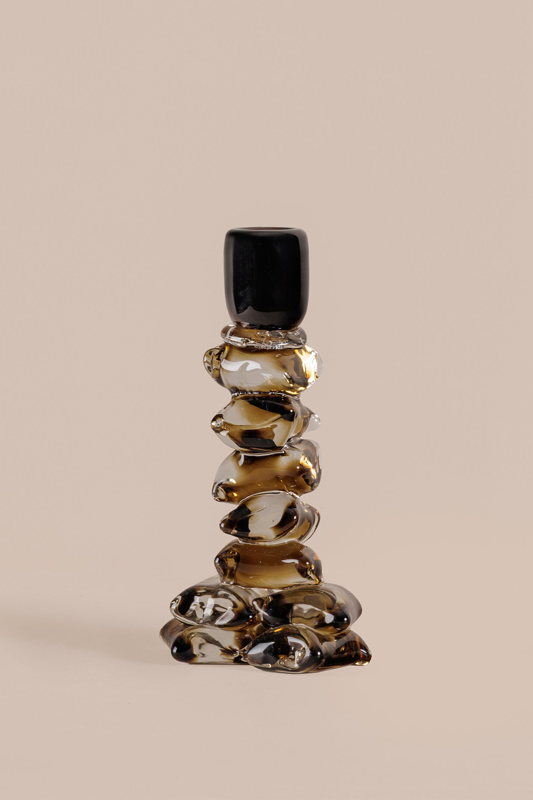 Enhance your living space with this stunning handmade glass candlestick holder, measuring 12 × 10.5 × 23 cm. Its distinctive stacked block design in rich green and smoky hues blends artistry with function, making it a standout piece in any modern home decor.