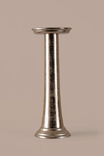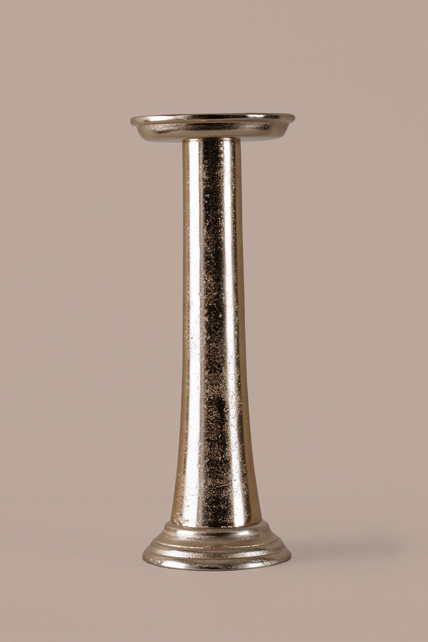 A tall candle holder crafted in antique gold metal with a slim fluted body and a smooth circular top. It adds height and elegance with a warm, vintage glow.