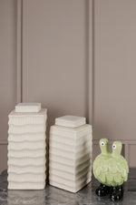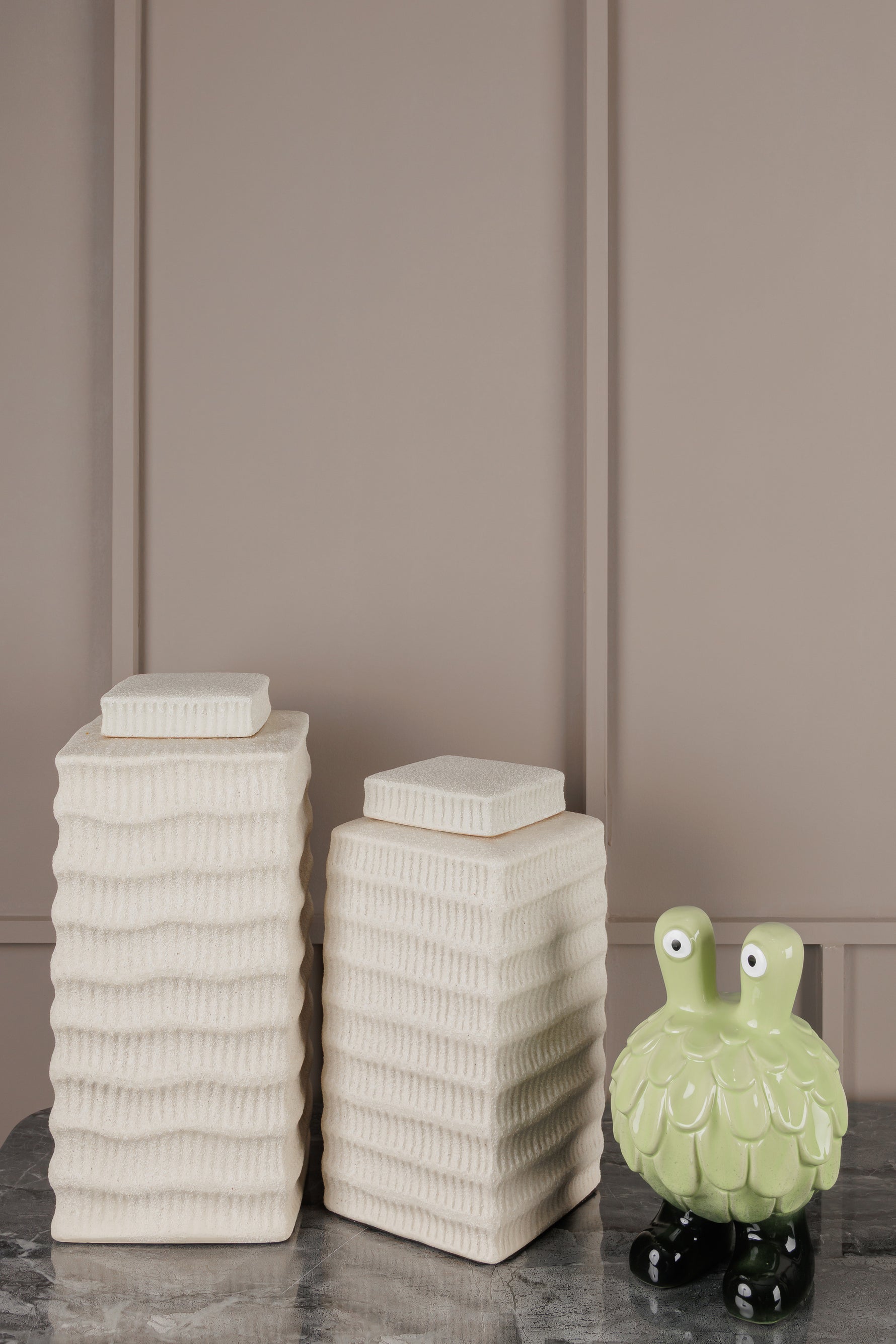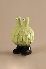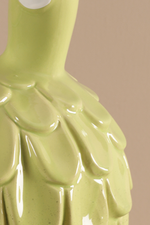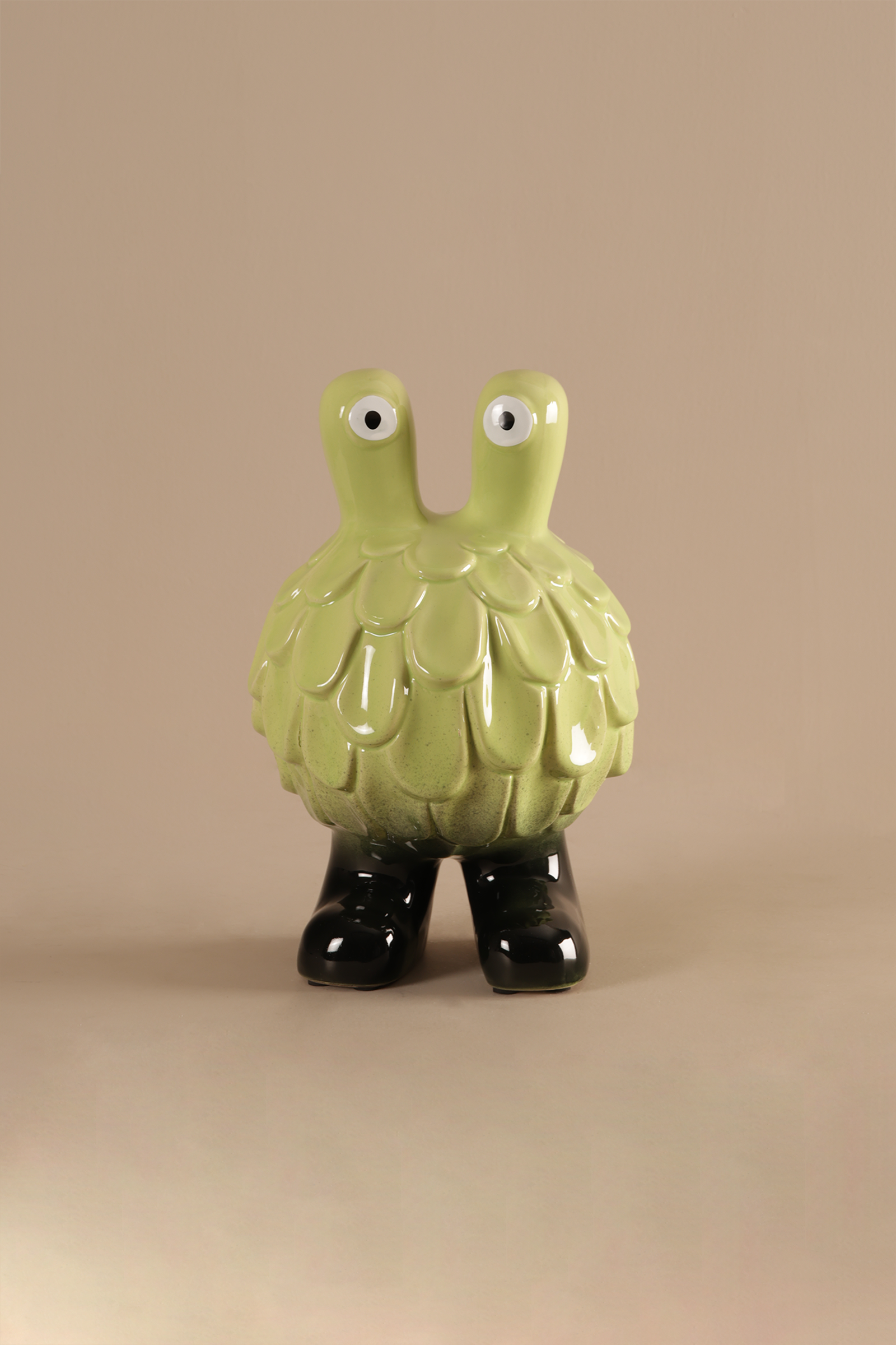 This color-glazed ceramic figurine features a wide-eyed green elf with textured leaf-like detailing and rounded feet. A cheerful accent for modern shelves, kids' spaces, or eclectic decor collections, it brings charm, humor, and artistic flair to any room.