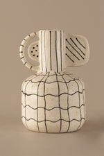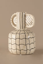 This sculptural vase is where form meets function—with a playful twist. Covered in a hand-drawn grid pattern and featuring an asymmetrical handle detail, it feels both architectural and expressive.