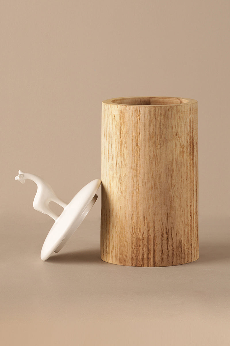Sized at 12×12×25 cm, this mid-sized jar balances utility and aesthetics with a natural container and a white ceramic lid, finished with a giraffe motif. A versatile home accent that suits both nursery décor and modern shelf styling.