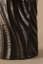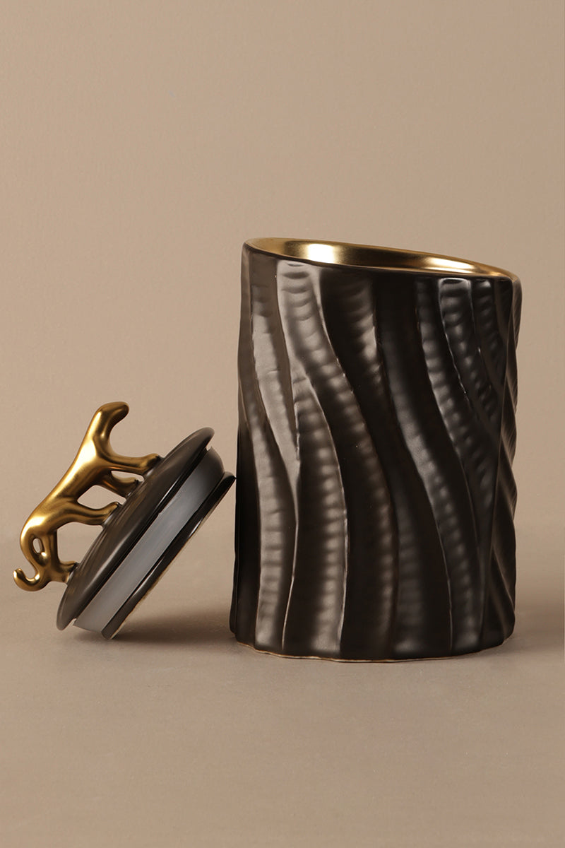 It is a decorative ceramic jar featuring a sculpted gold leopard on the lid, paired with a matte black body embossed in a wave-like pattern. Ideal for use as a statement container or standalone accent piece in modern interiors.