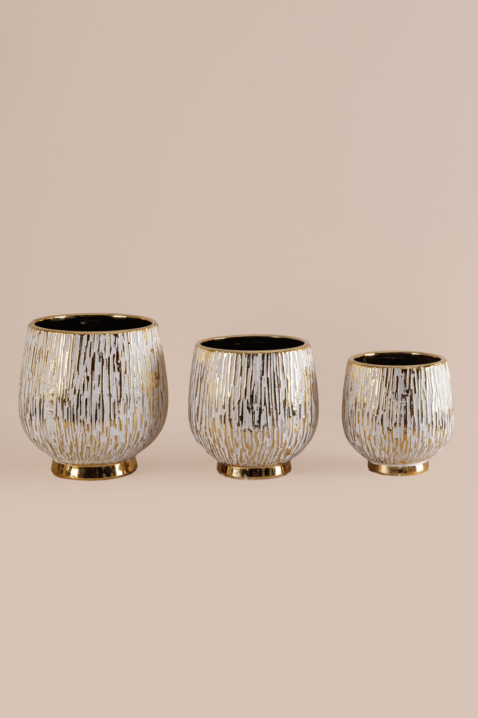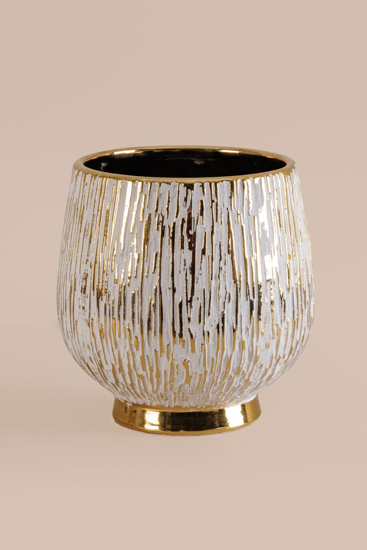 This ceramic vase is a stylish and versatile home décor item, perfect for adding a modern touch to any room. It is made from durable ceramic. It features a textured design with a silver finish and gold base, creating a unique metallic look. The inside has a smooth black glaze for a clean and polished finish.