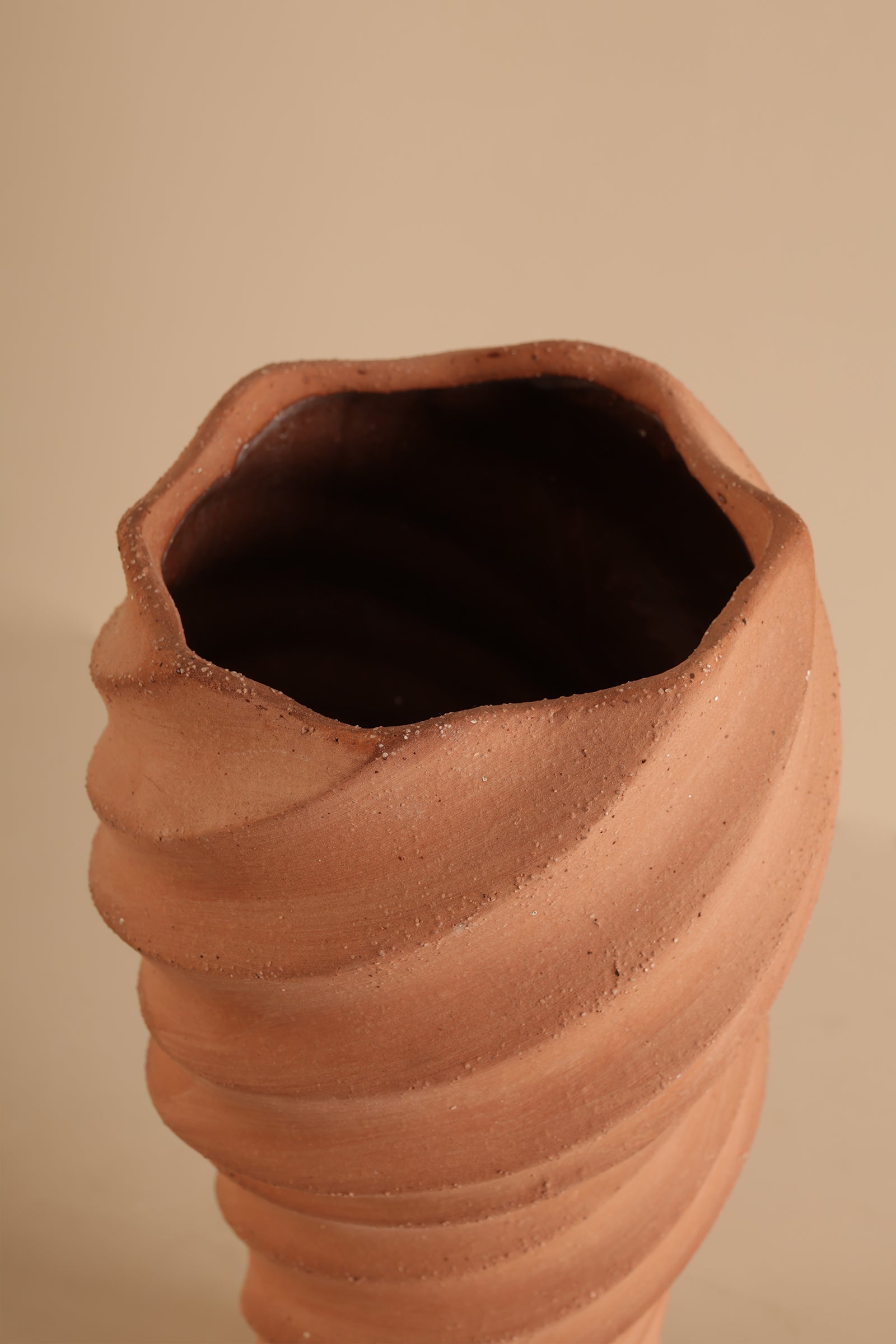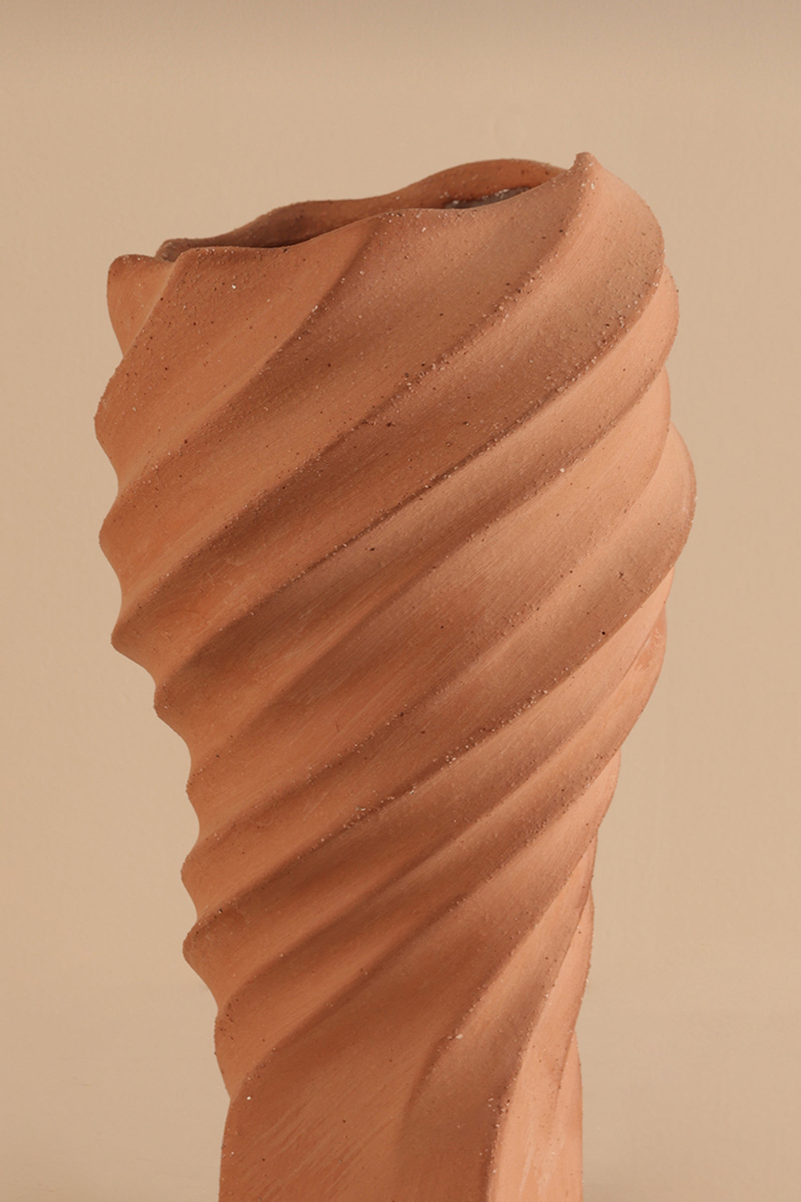 This sculpted vase features a dynamic spiral twist design and a natural matte finish. Its sculptural form adds texture to contemporary, rustic, or earthy decor themes.
