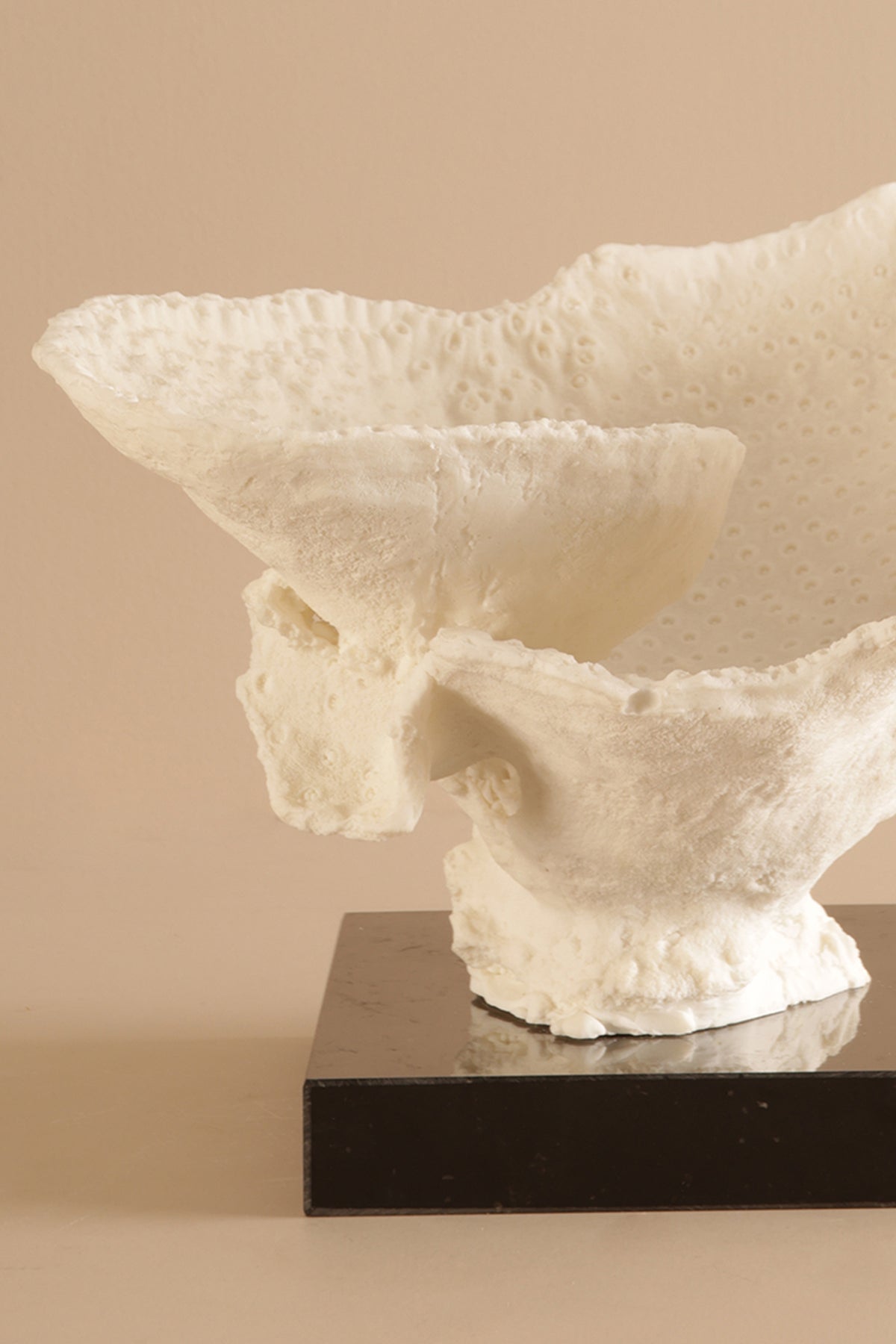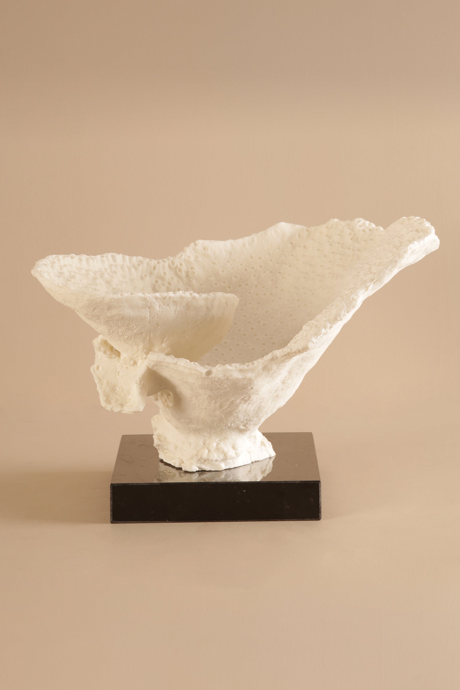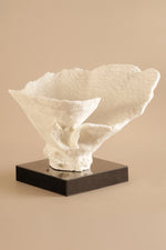The delicate form of this sculptural piece mimics a blooming petal, frozen mid-flutter. Mounted on a contrasting black base, the ivory-toned structure brings a soft, organic presence to shelves, consoles, or centerpieces.