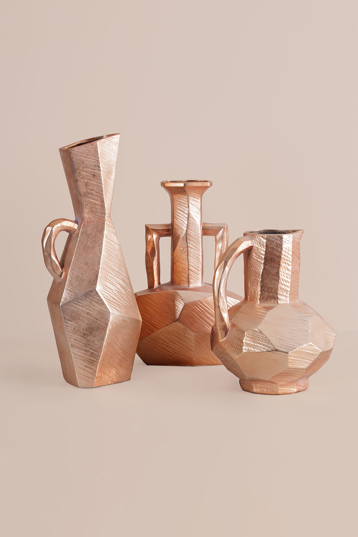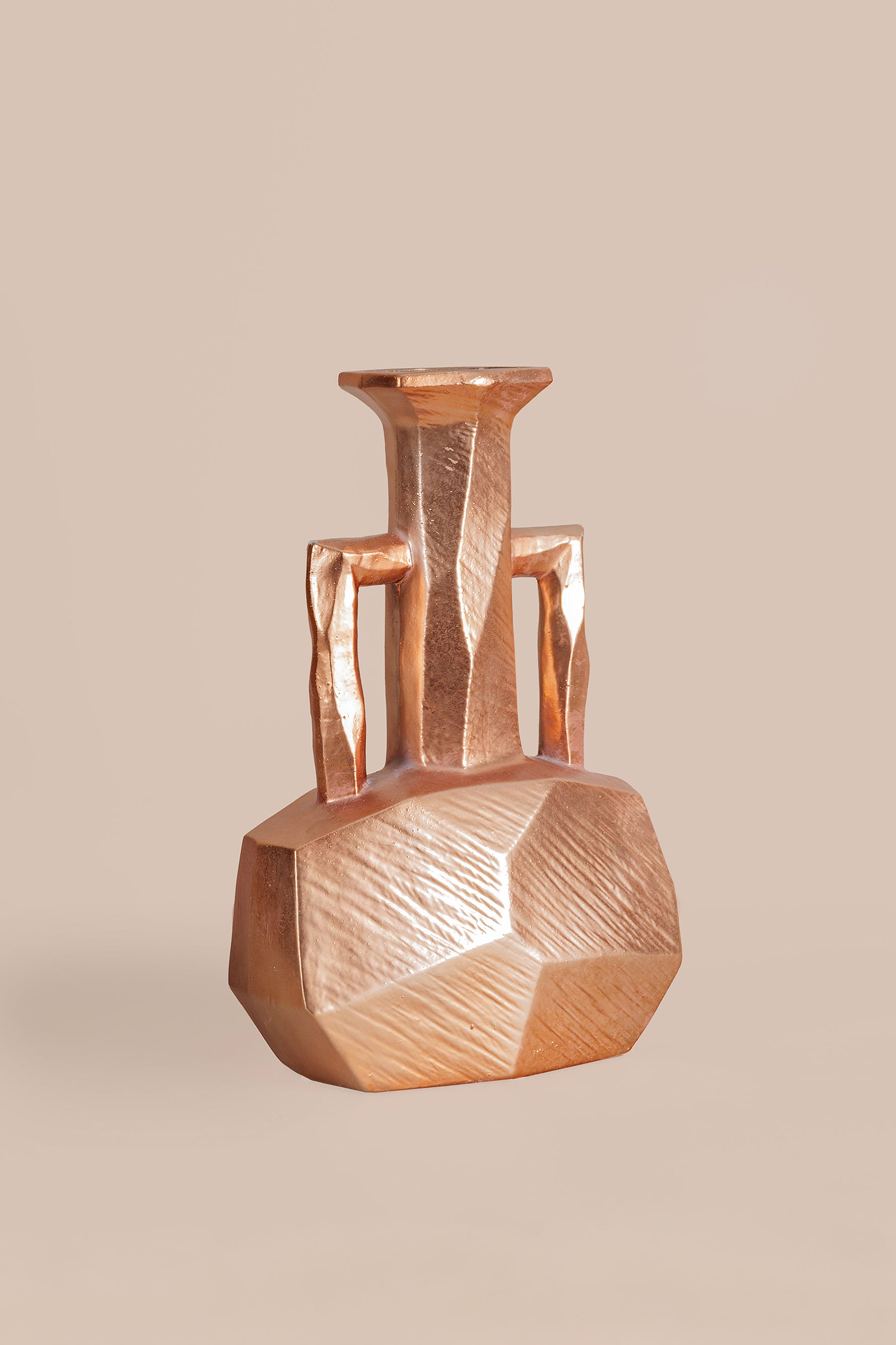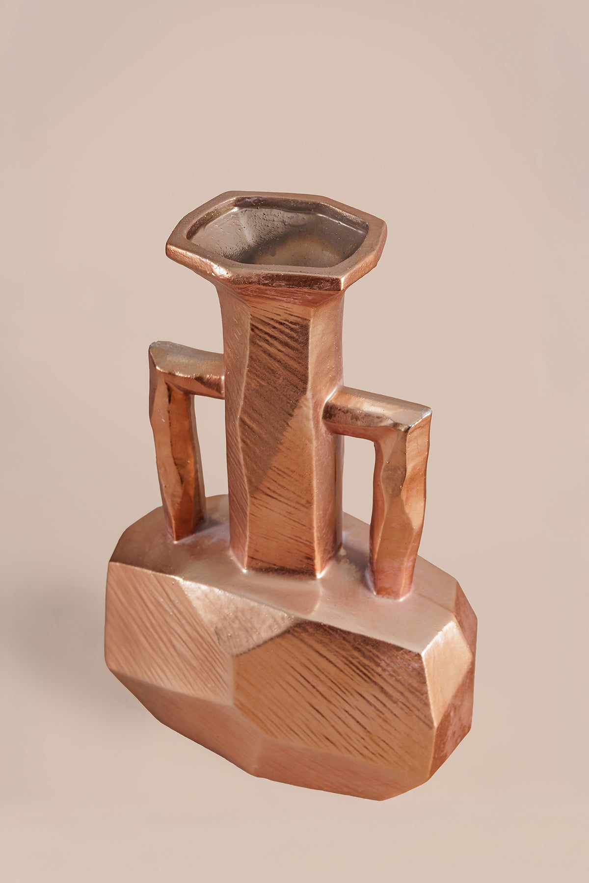 The Golden Portable Pot A Ceramic vase is a bold fusion of geometric design and metallic elegance. Crafted from ceramic and finished in a radiant gold tone, this sculptural vase features angular facets and twin rectangular handles that evoke modern architectural forms.