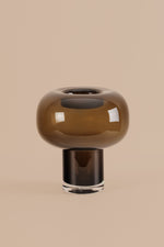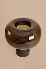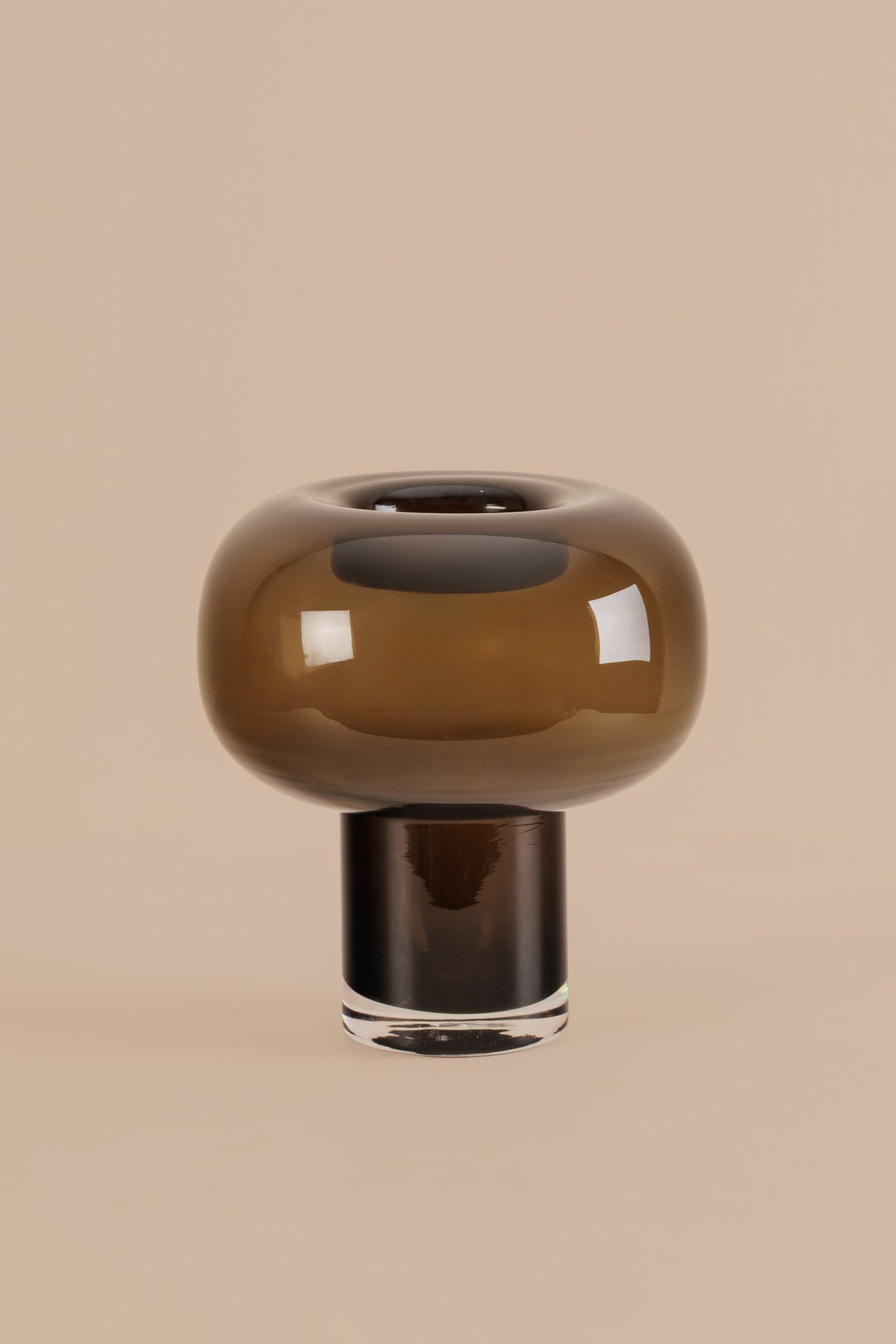 Murrina olive vase is a large yet modern glass accessory featuring a smooth, rounded top in a rich olive tone, supported by a sleek cylindrical base. Its glossy surface and playful shape offer a contemporary edge with a refined twist.