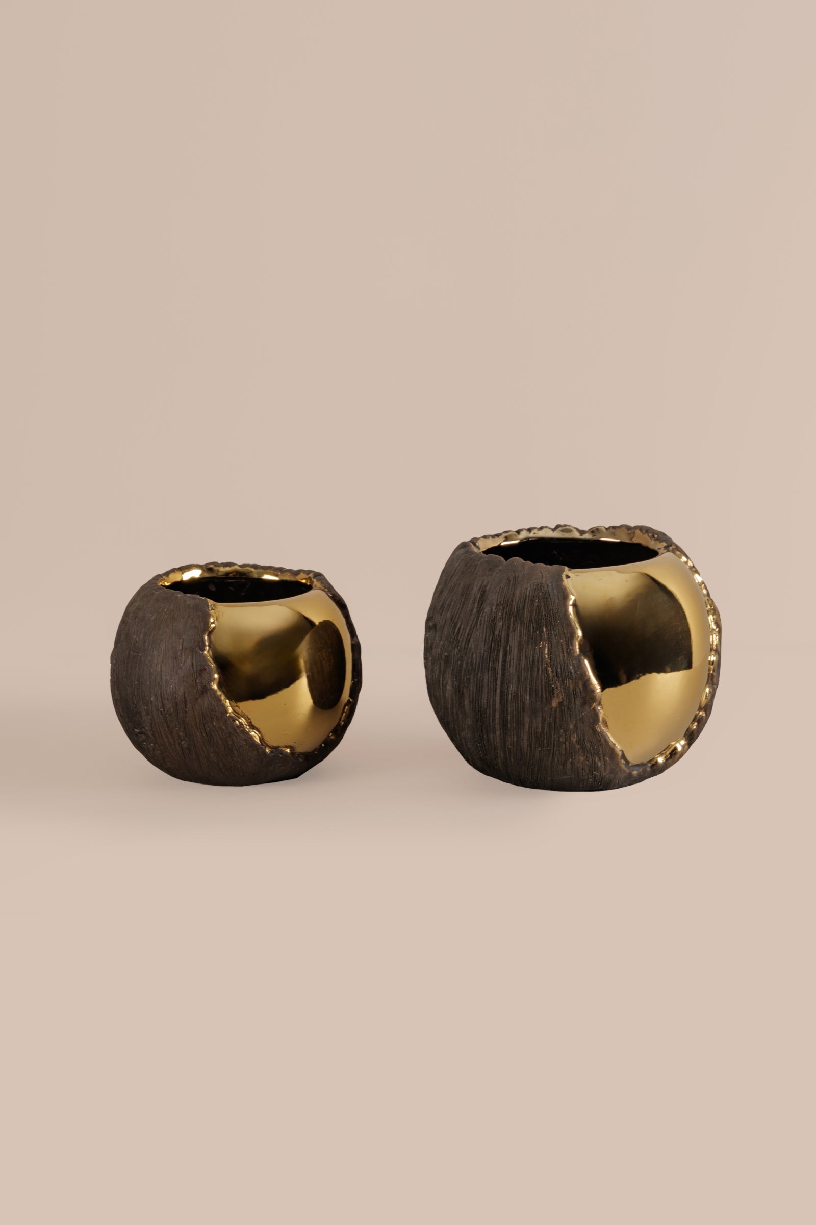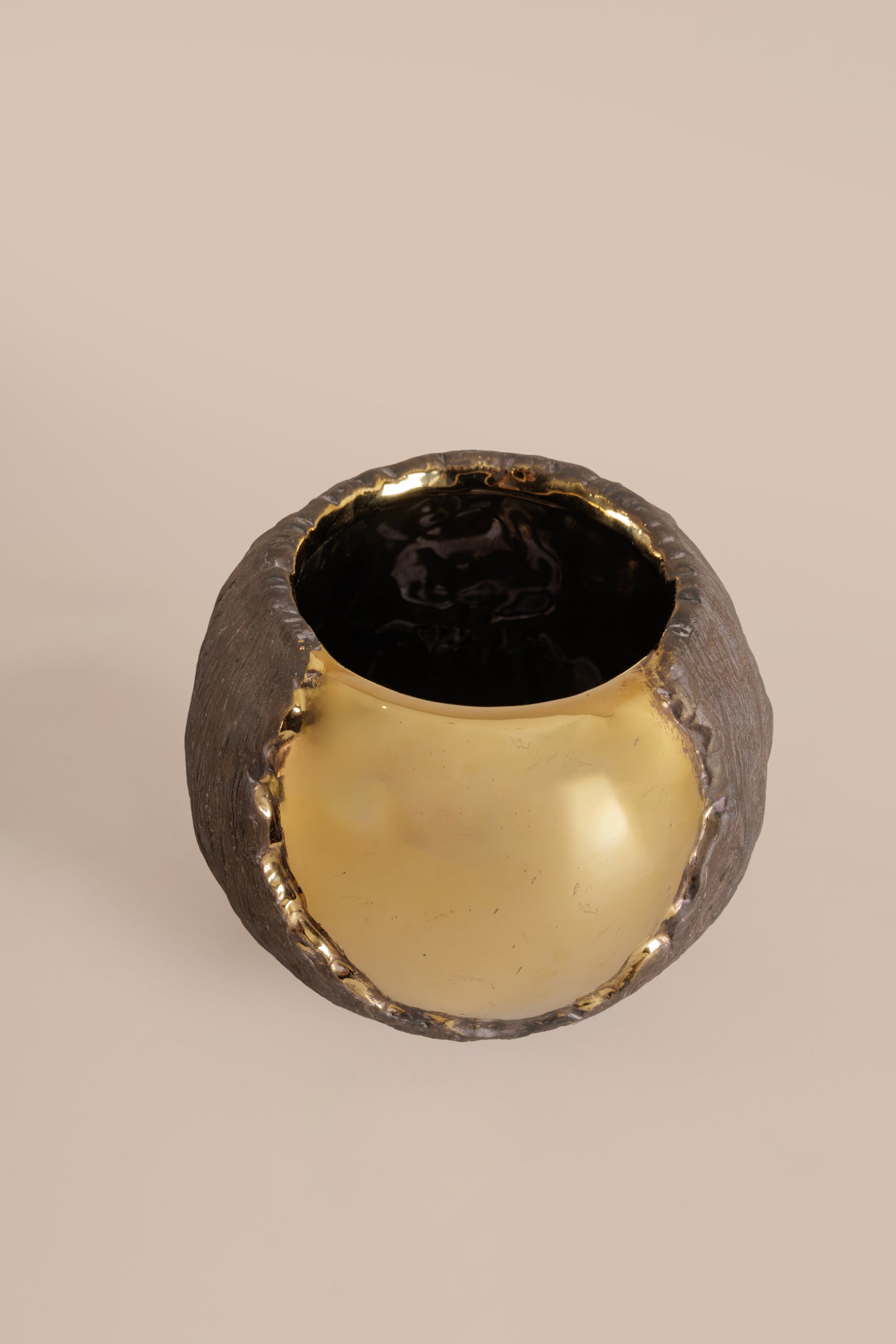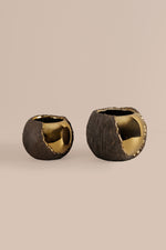 Sophisticated vase in small size that blend raw texture with lustrous shine. This Renault Golden Vase home decor piece features a striking dual-finish—one side showcasing a bold matte charcoal surface, the other wrapped in a polished reflective gold glaze. The result is a bold yet balanced contrast that adds depth and dimension to any room.