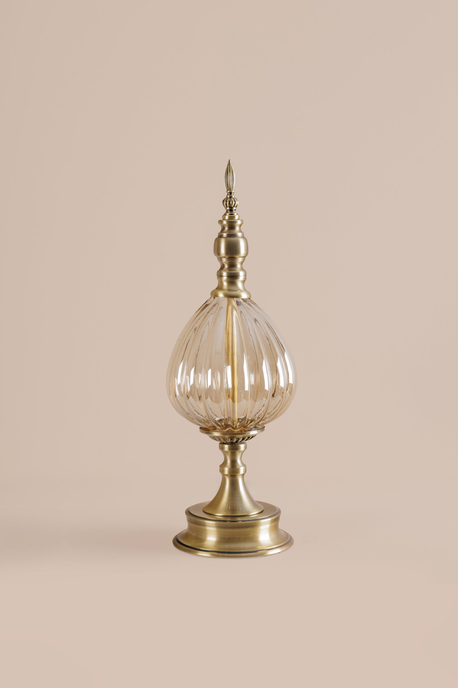 The Roma Finials lux Sculpture - L offers classic symmetry and ornamental detail. This home decor item features a pair of elongated finials crafted in brushed antique brass with ribbed glass centers. It evoke timeless charm and architectural grace.