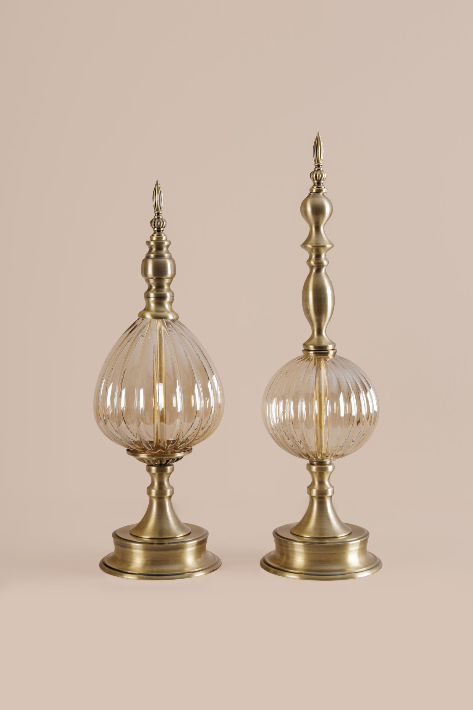 The Roma Finials lux Sculpture - Soffers classic symmetry and ornamental detail. This home decor item features a pair of elongated finials crafted in brushed antique brass with ribbed glass centers.