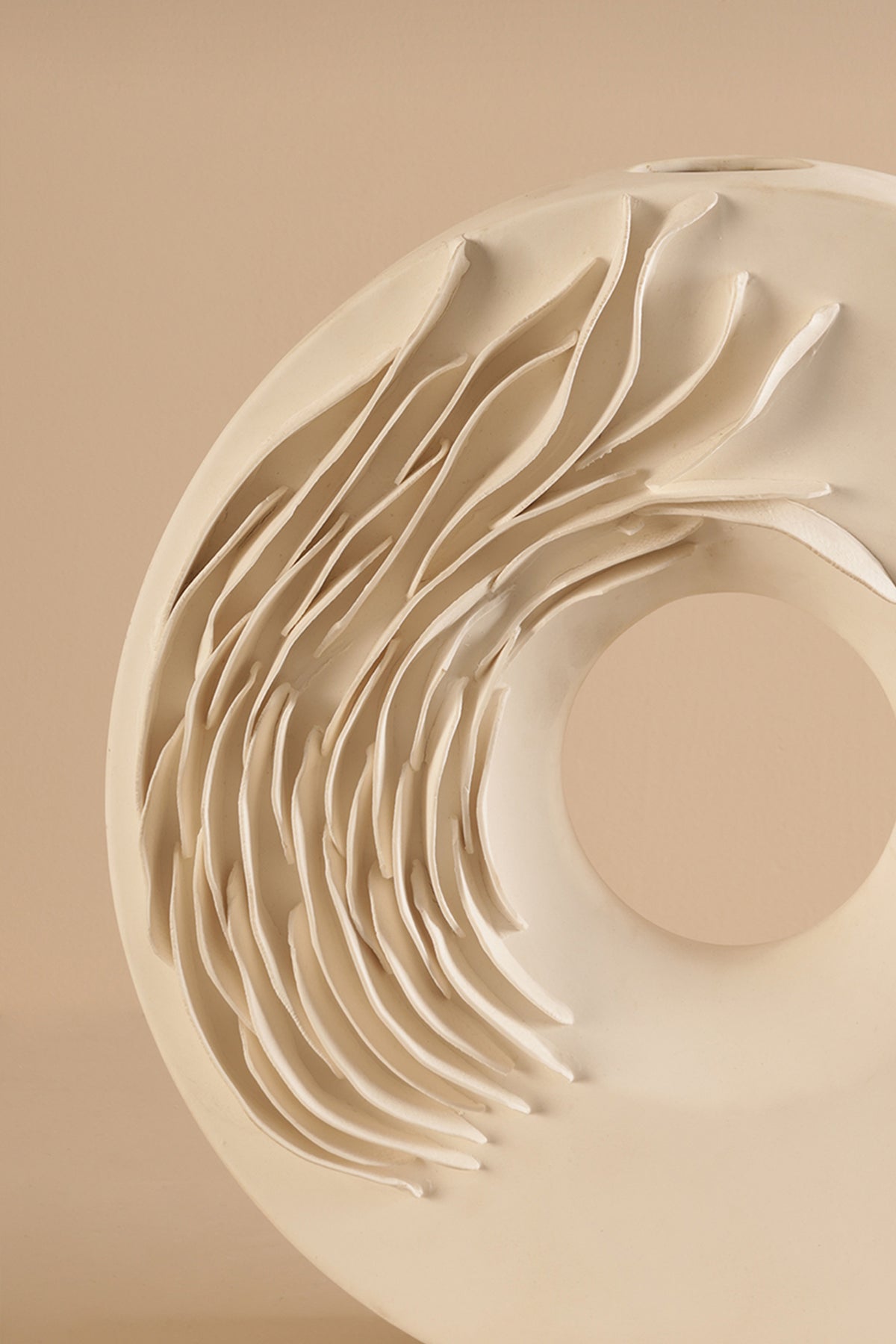 Enhance your space with this sculptural decor item—an artful fusion of form and texture. With a clean circular silhouette and wave-inspired detailing, this piece doubles as both a decorative accent and a conversation starter.