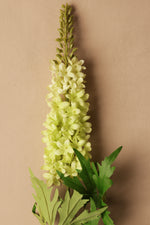 It is a tall artificial lupine stem with layered blossoms and carved leaves, perfect for vases and floral arrangements.
