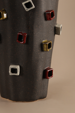 This Italian modern vase features a matte black finish adorned with raised multicolored cube accents. Its tall, flared form and sculptural surface create a commanding visual presence, making it a standout piece for contemporary interiors.