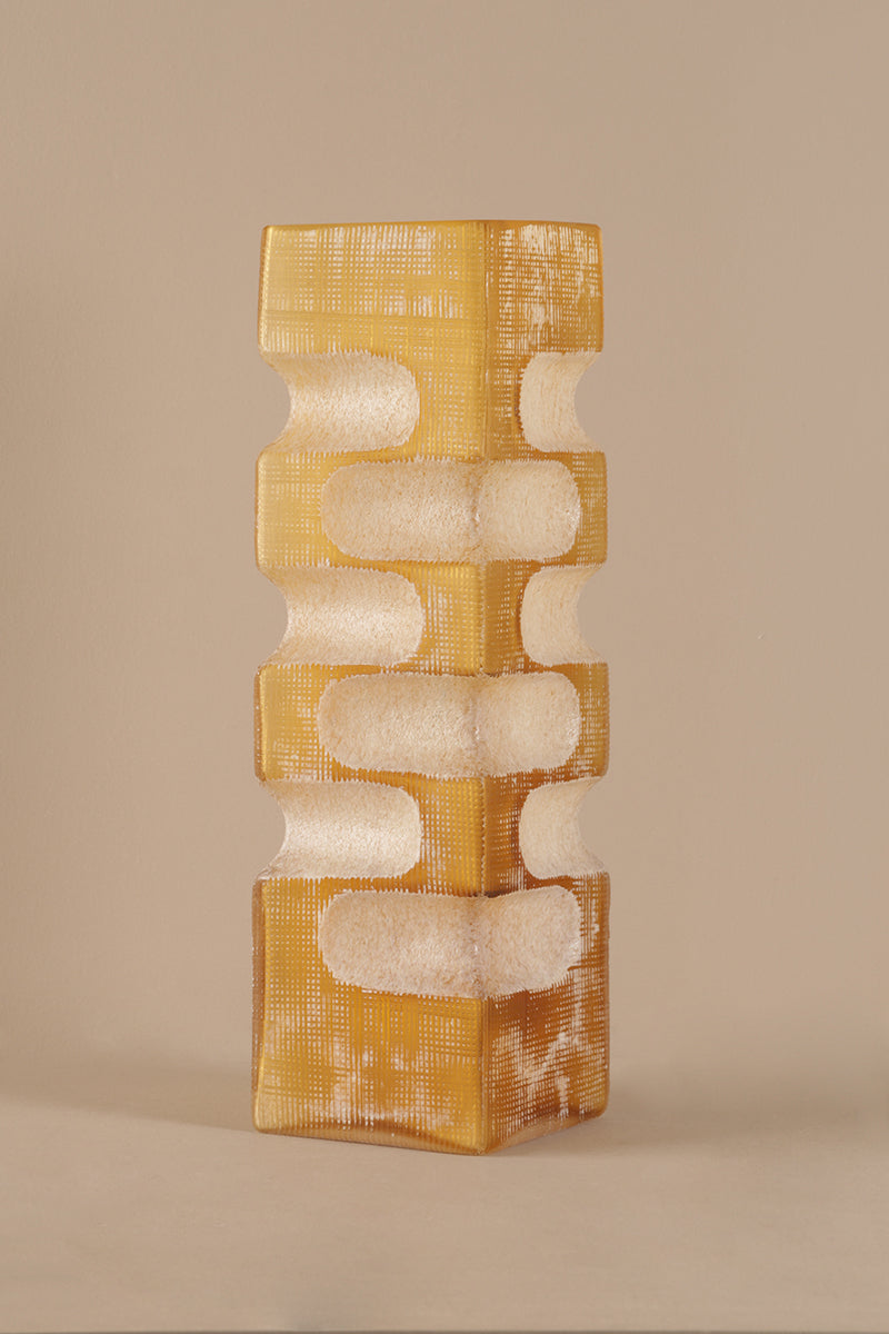 A bold blend of texture and transparency, High-Rise Yellow Vase A stands tall with its architectural form and stacked carved design. The amber-yellow glass is accented with contrasting white grooves, adding dimensional flair to modern spaces.
