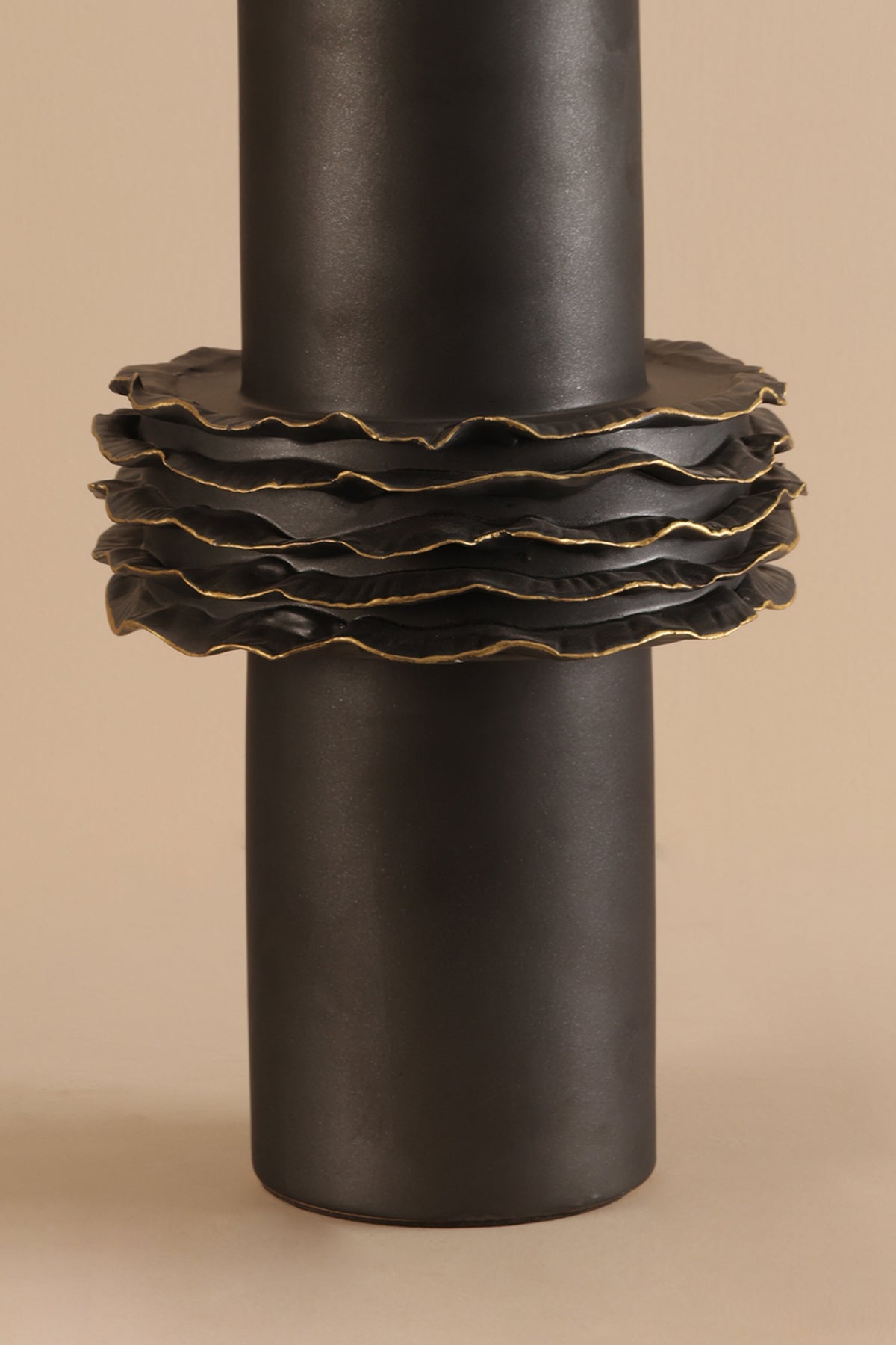 This Vasqué Ceramic Vase features a tall cylindrical silhouette in deep matte black with a dramatic layered loop detail at the bottom. The artistic ruffle-inspired texture adds playful sophistication, making it the perfect centerpiece for modern and eclectic interiors.