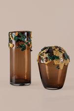 A tall and graceful glass vase with an amber finish and leafy accents that wrap around the top. Its slim design makes it perfect for narrow spaces like shelves or side tables. A great way to add a natural touch to your decor.