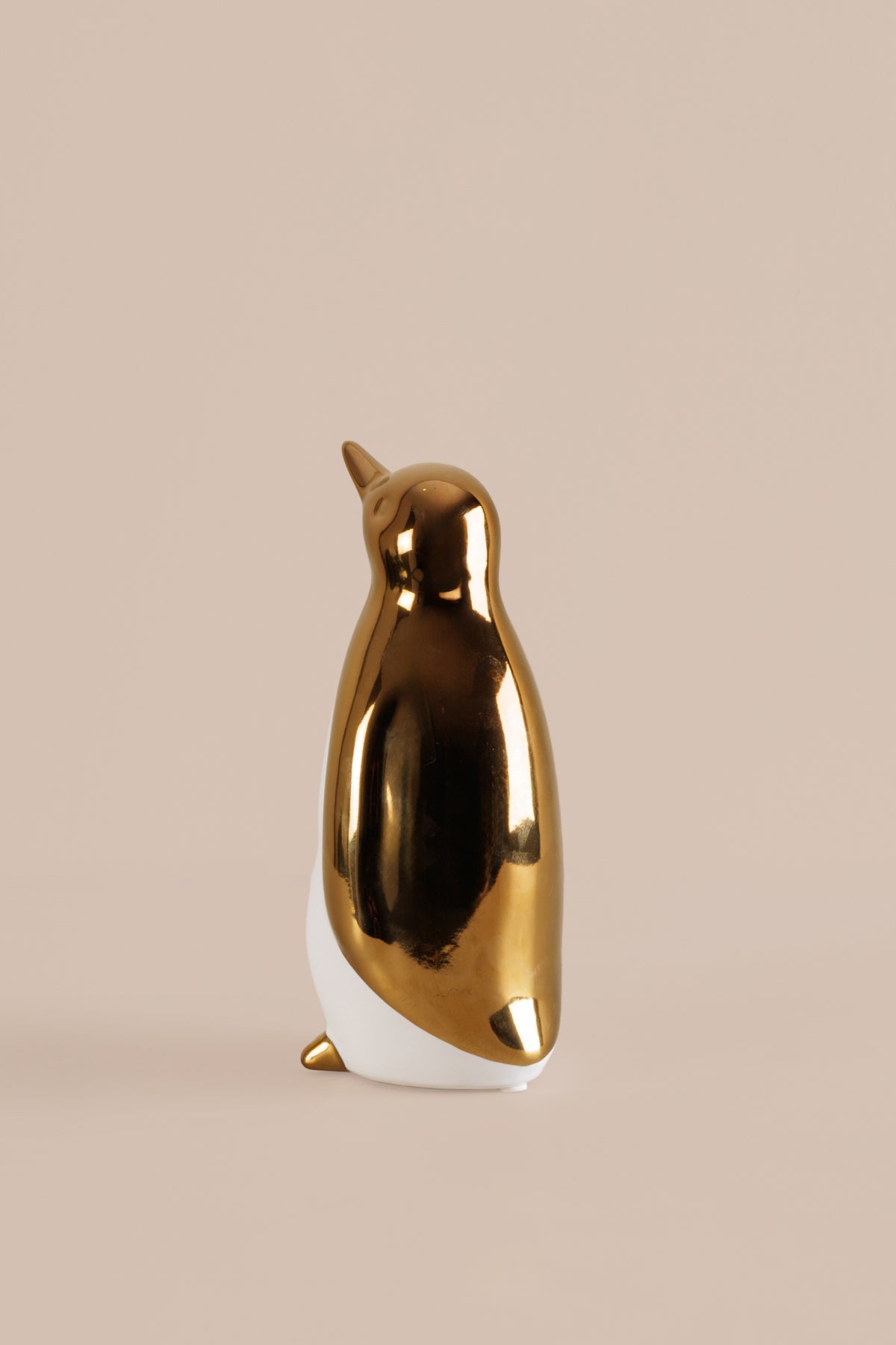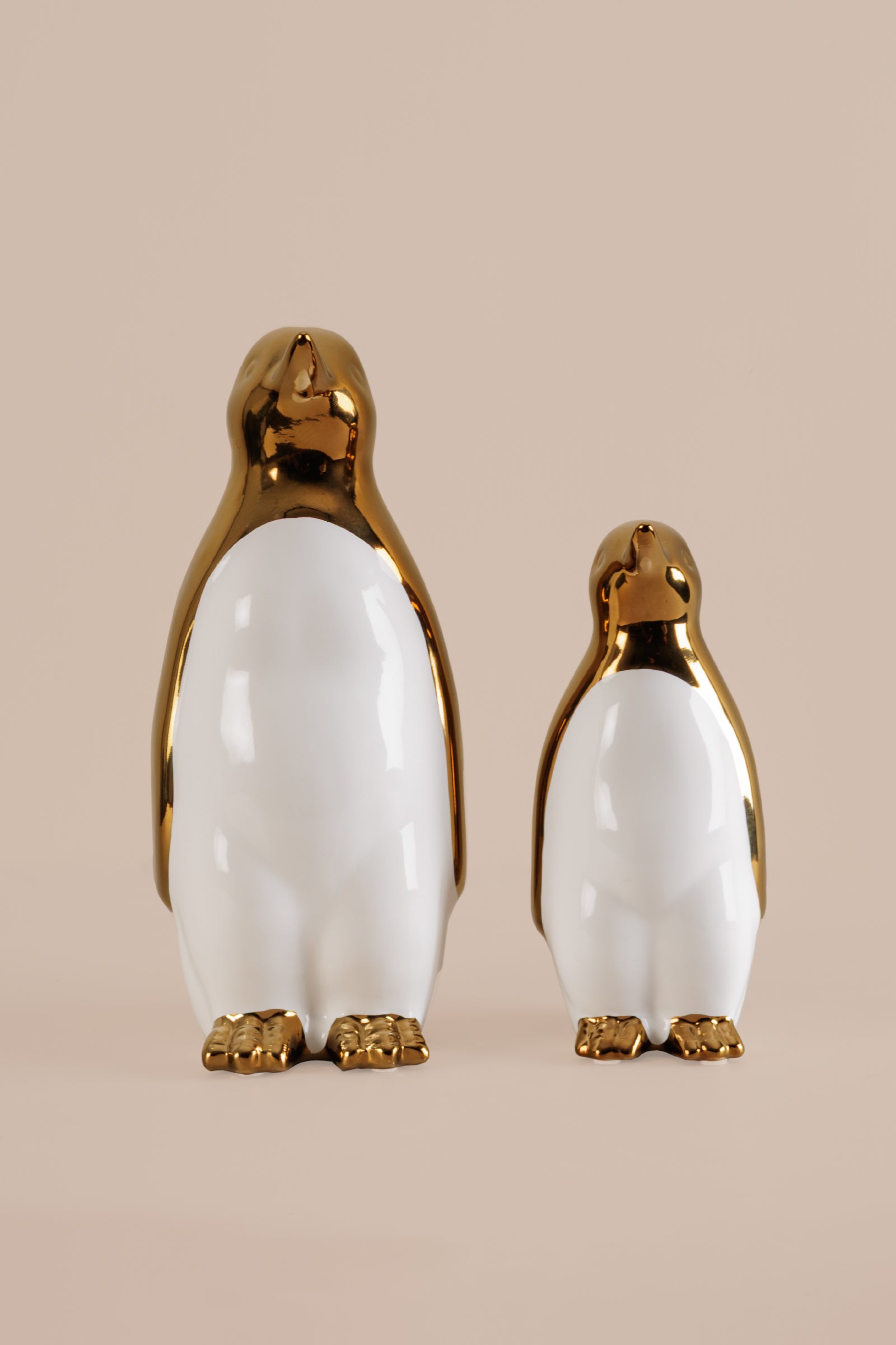 The Aurora Penguin is smaller in size and brings refined character to any space with its smooth white body and brilliant gold accents. This ceramic home decor item features a compact form with detailed features, showcasing a modern take on animal sculpture. The glossy gold finish on the head, flippers, and feet enhances its visual appeal and adds a hint of luxury to your decor.