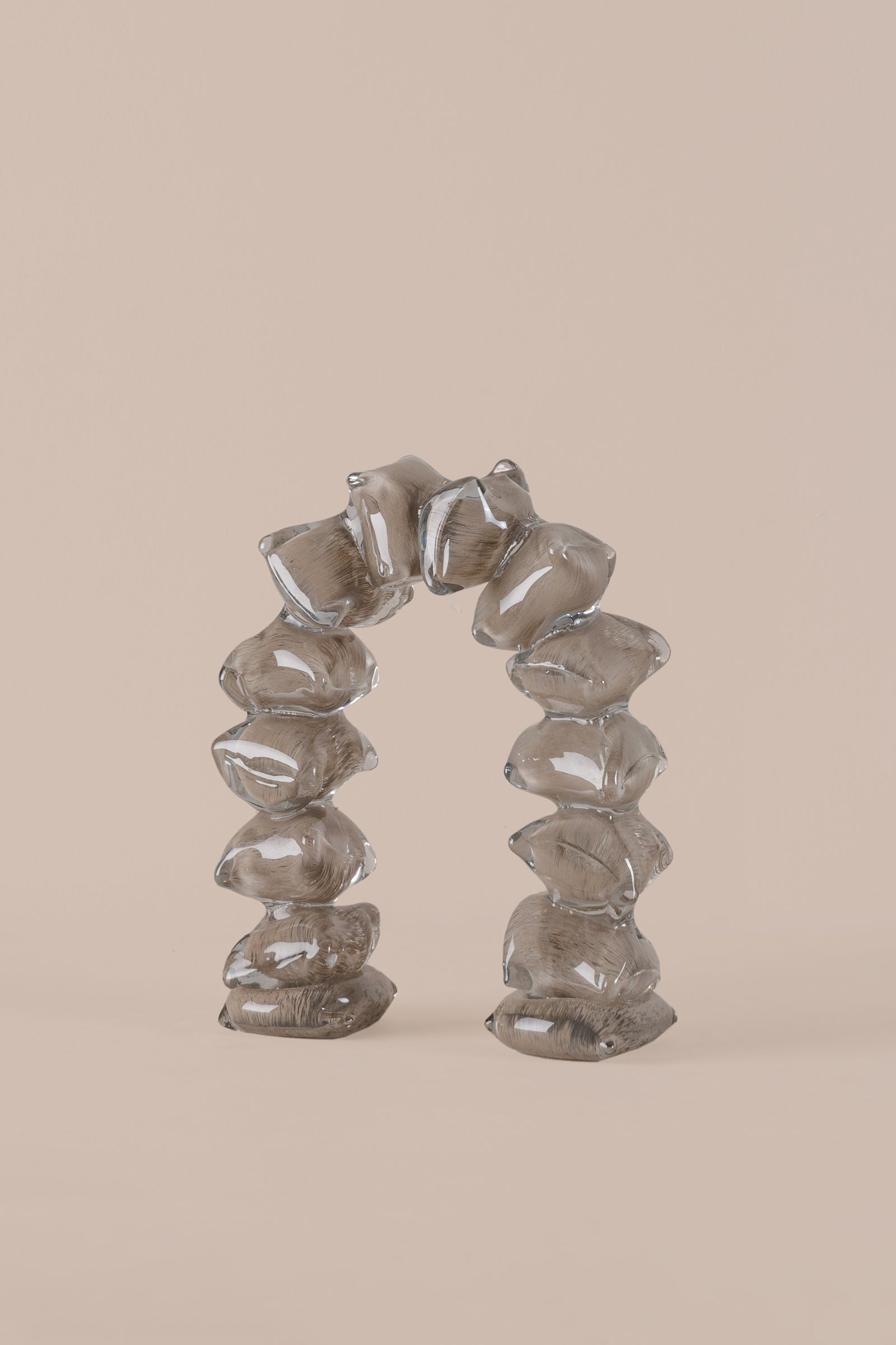 This unique decorative piece features fluid, hand-formed blocks of rich coffee-toned glass, organically stacked into an abstract arch.