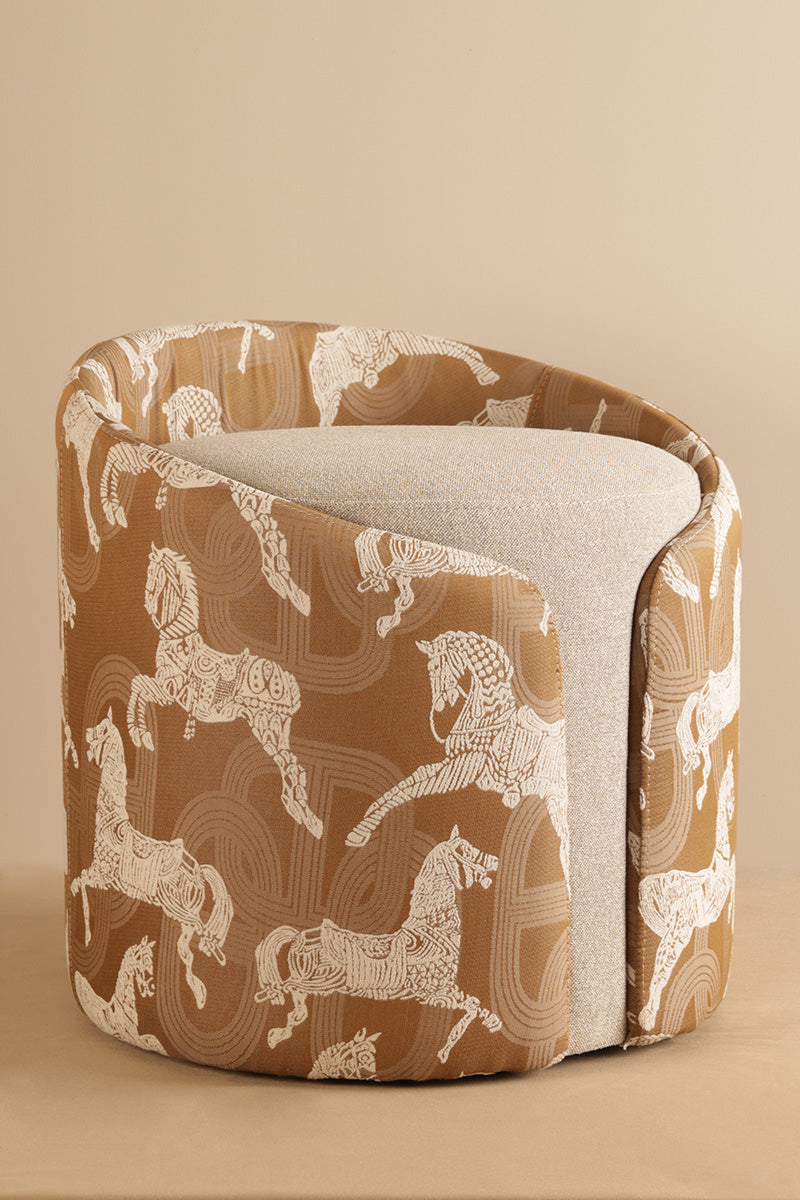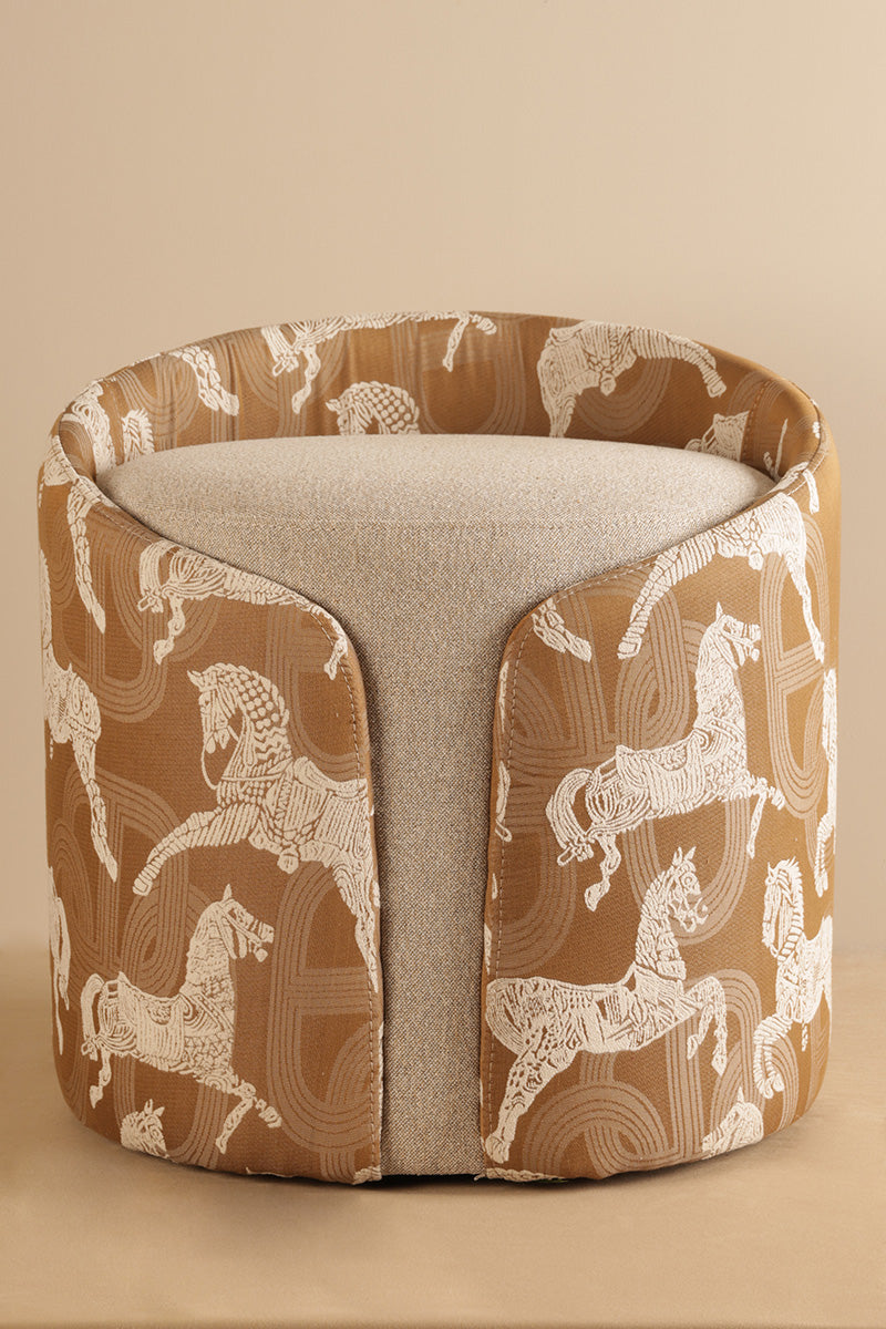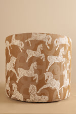 A chic barrel-style ottoman featuring a soft, rounded form with a neutral cushioned seat, wrapped in a striking horse-print fabric that adds playful character and artistic charm to any room.