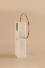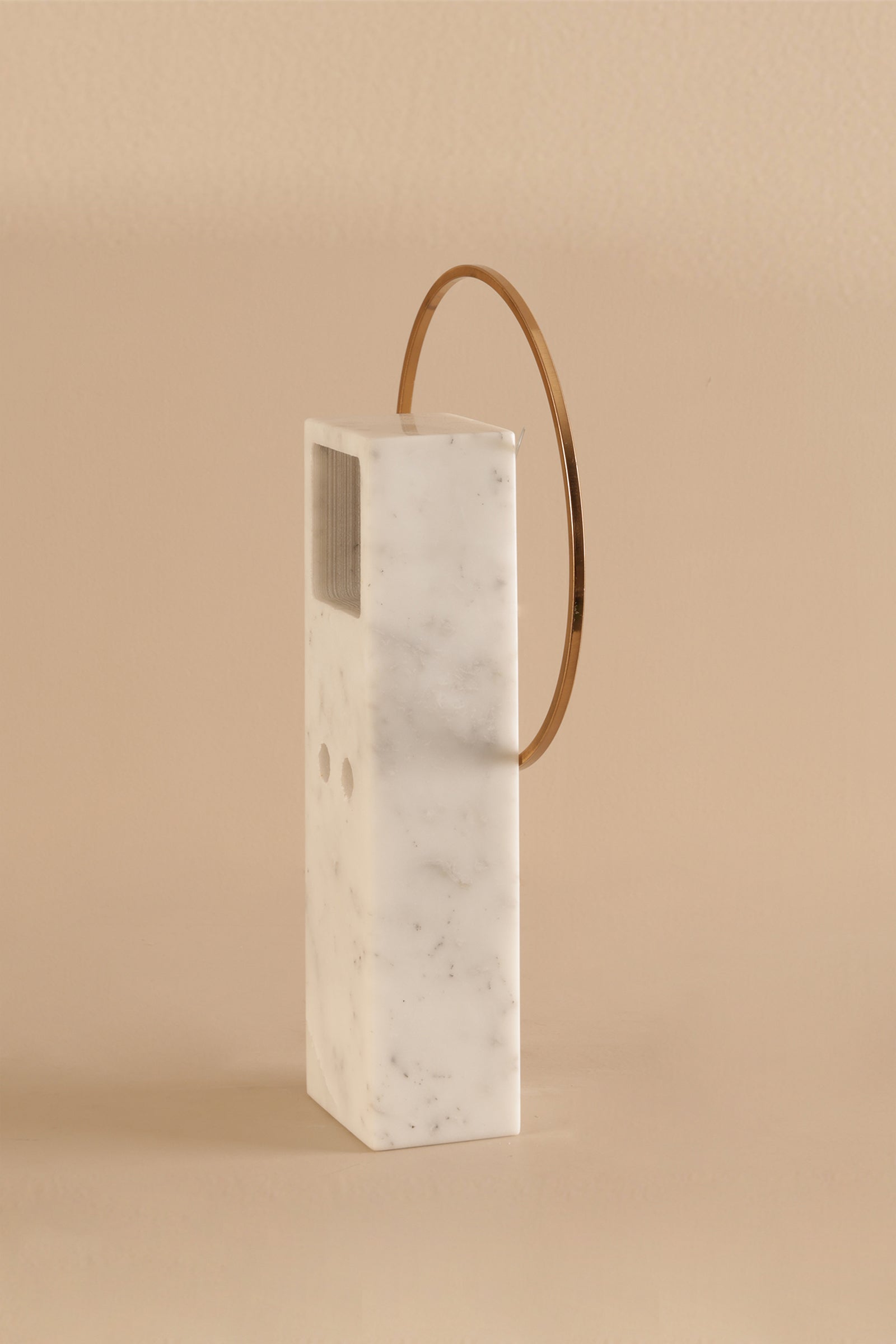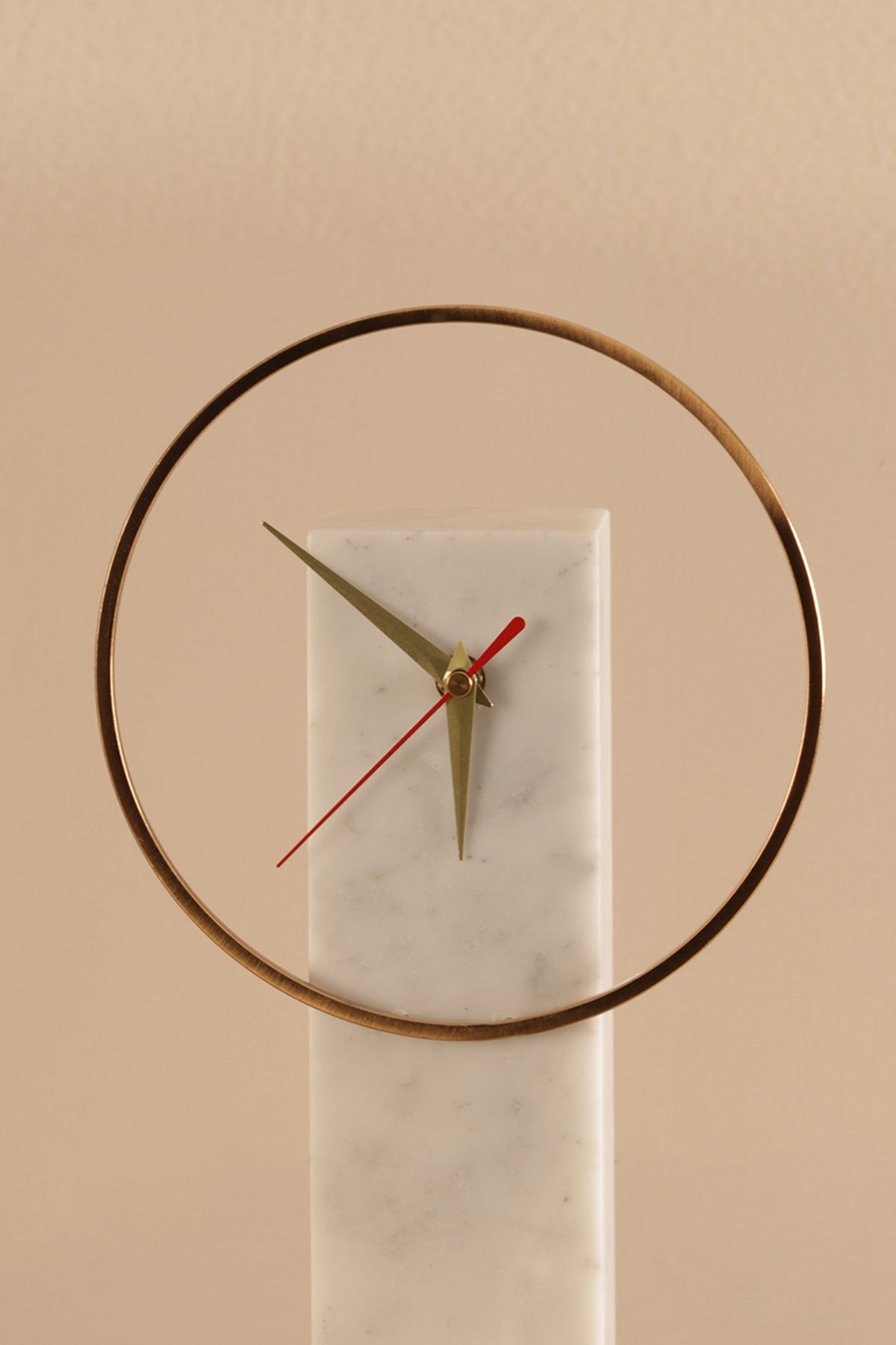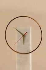 A sleek golden ring floats around a solid marble base, where minimalist hands mark the hours in delicate contrast. With its airy structure and modern aesthetic, this piece blends functionality with art—perfect for interiors that value quiet sophistication.