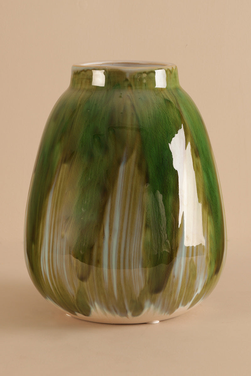 A graceful vase with a tall, curved profile and nature-inspired glaze, this piece blends earthy tones with a fluid, glossy finish. The layered green and soft ivory hues add depth and movement—ideal as a standalone statement or paired with minimal florals.