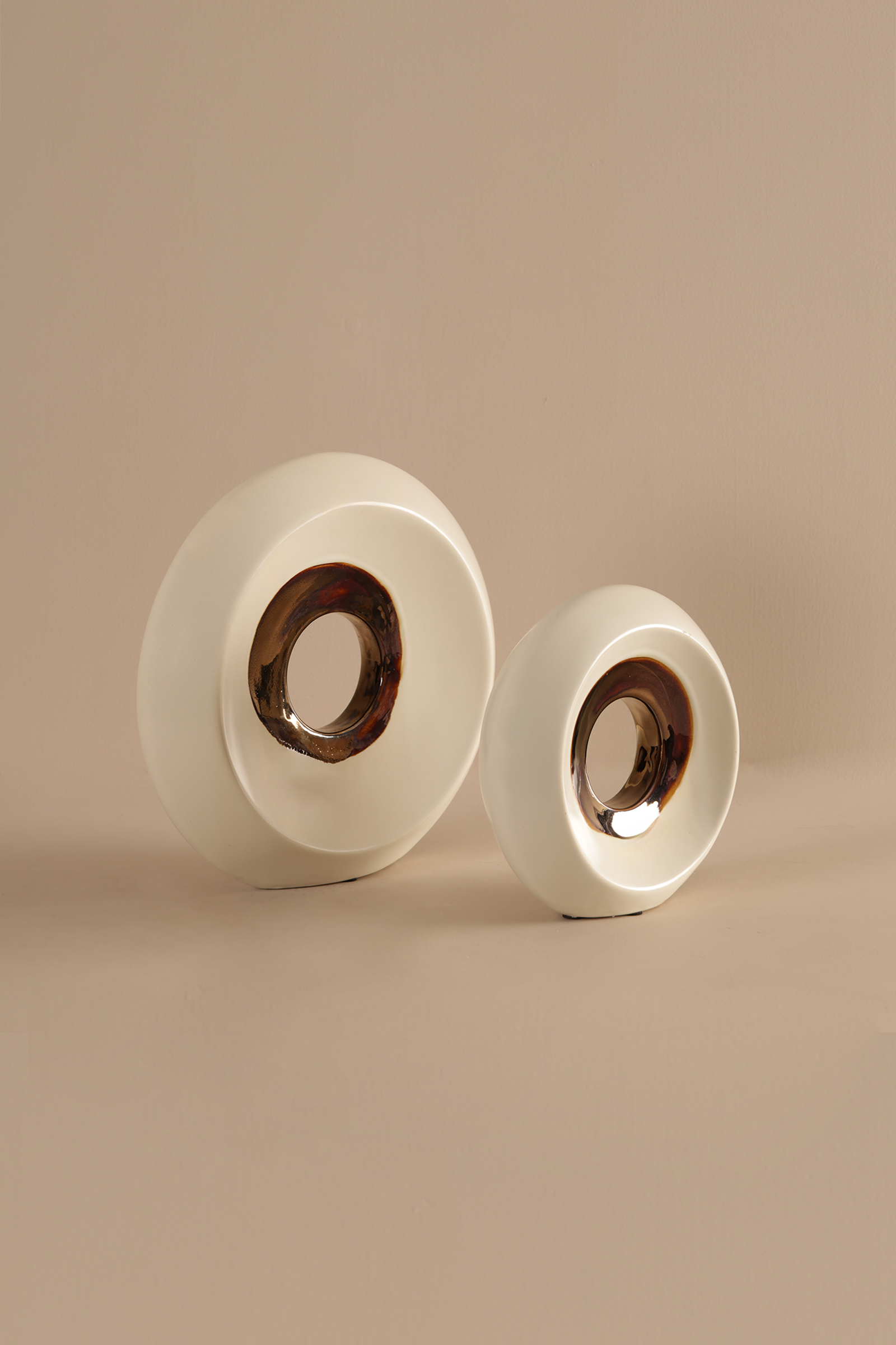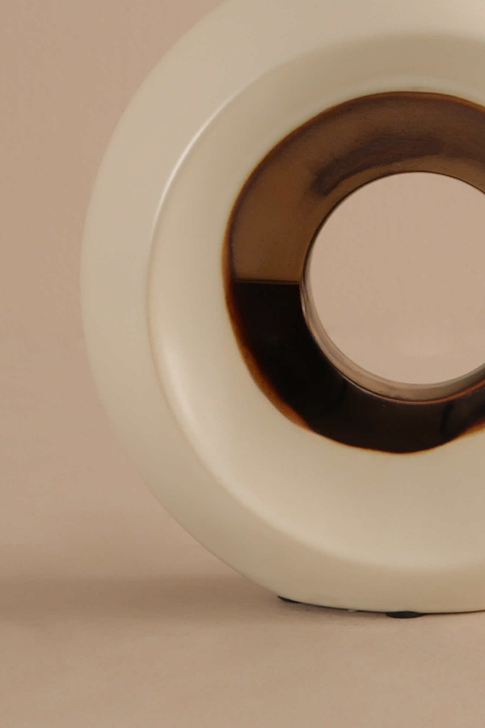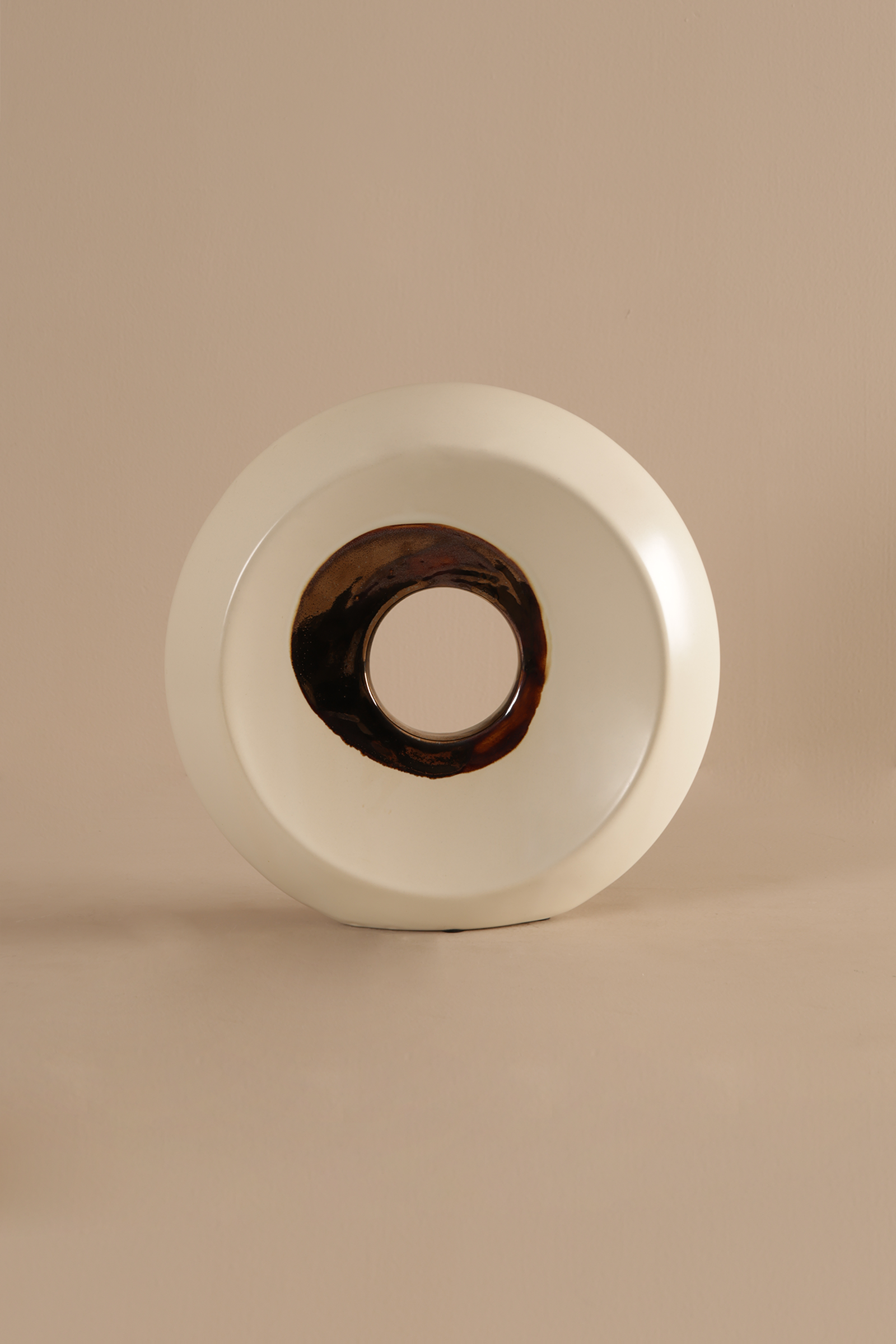 Cavy decor is a sculptural piece defined by its circular silhouette and central cutout. Measuring 24.5 × 7 × 23.5 cm, this modern ornament features a smooth white matte finish contrasted by a dark metallic glaze around the central opening, creating depth and visual intrigue.