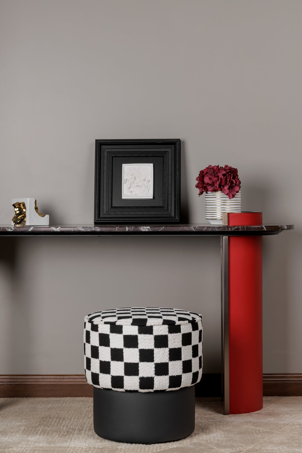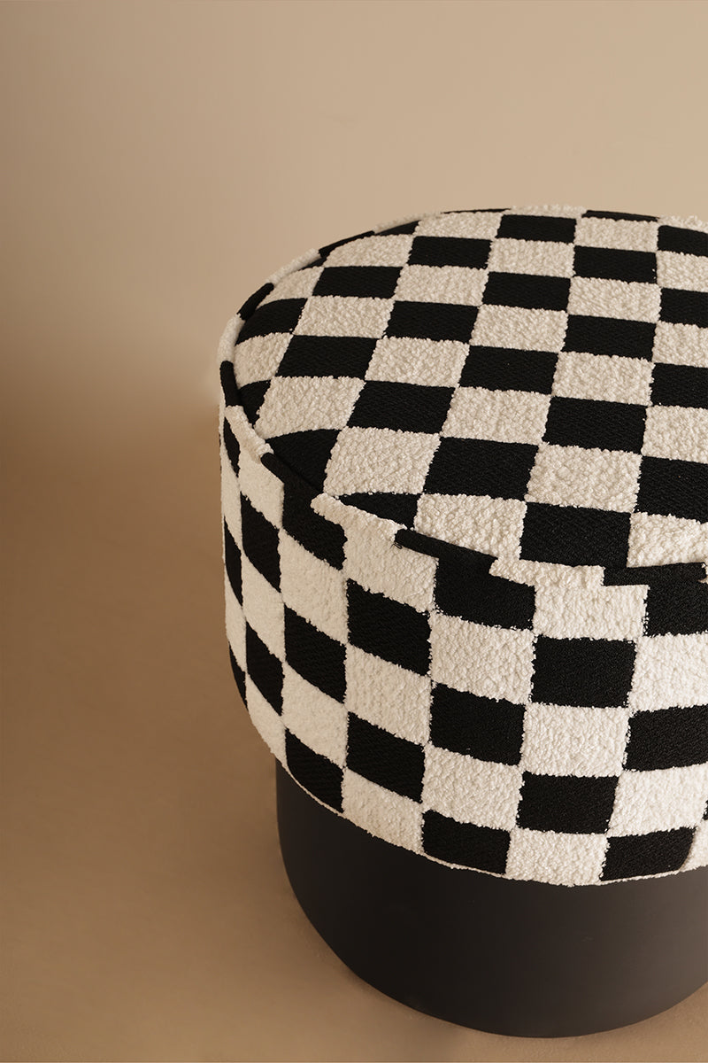 A bold and modern upholstered stool designed with a striking black and white plaid pattern. The fully outfitted build with mounted feet ensures stability and durability, while its versatile design makes it a perfect accent for contemporary interiors.