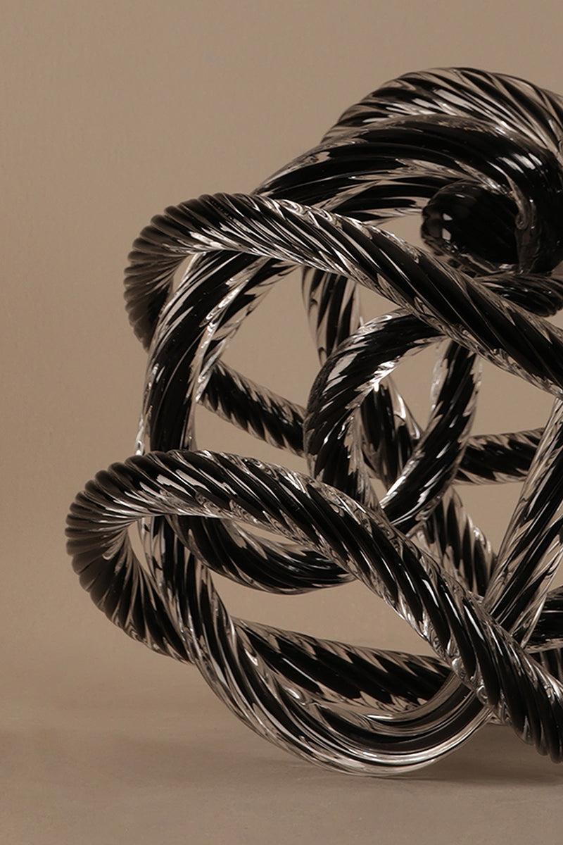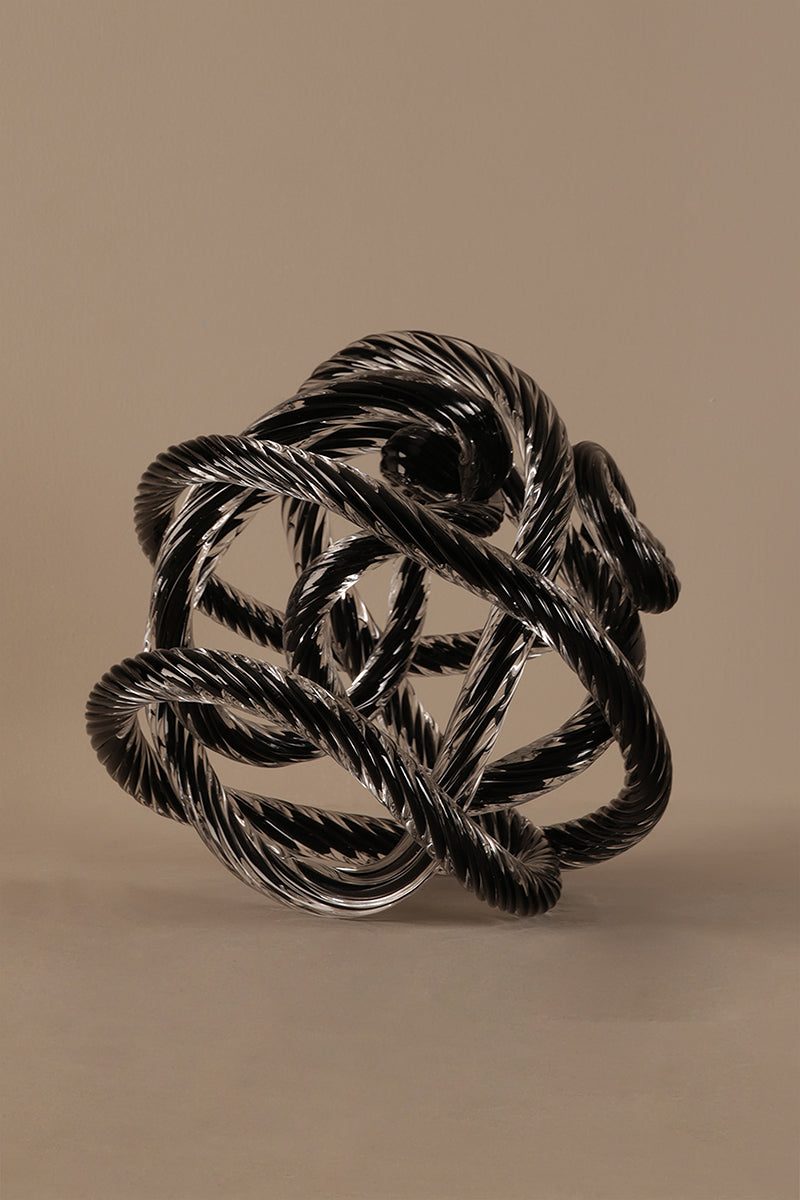This striking sculpture coils with energy and motion. Crafted in glossy black and silver tones, its braided, rope-like forms twist in an open spiral, creating depth and intrigue from every angle. Ideal for modern consoles or minimalist shelves, it adds a bold, industrial elegance to any space.